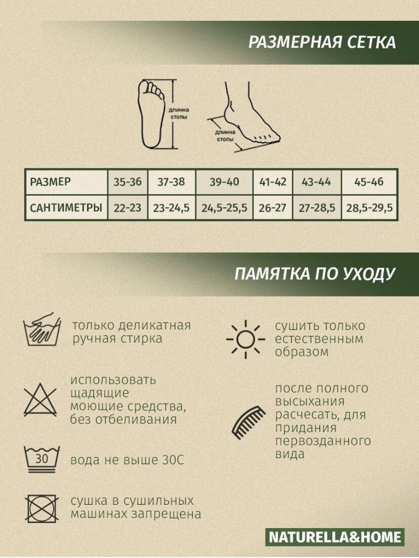 | Дополнительная информация | При выборе размера необходимо иметь ввиду, что из-за плотности меха, который мы используем при производстве тапочки первоначально могут показаться меньше, но вследствии неизбежной усадки меха внутри во время эксплуатации обуви, станут в размер. Просим при выборе размера ориентироваться на то, что тапочки предназначены на среднюю полноту стопы, а так же на параметры, указанные в описании, такие как длина стельки. При увеличенной полноте ноги или склонности к отекам мы рекомендуем выбирать для себя размер больше, чтобы обувь была комфортна при носке! |