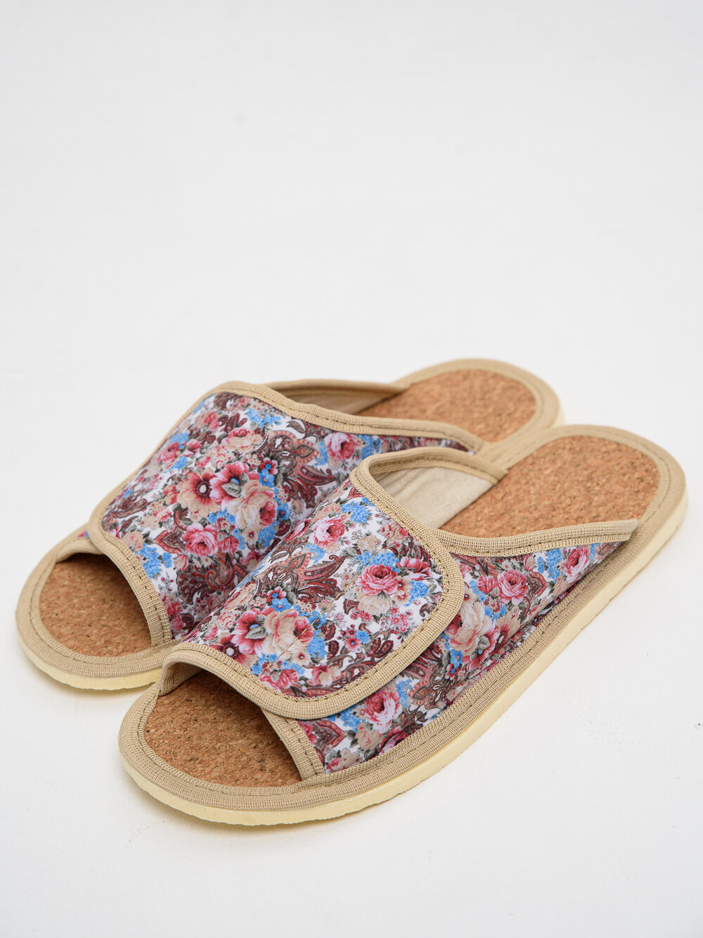 Женские домашние тапочки "LepiloV", открытые, на пробковой стельке и липучке. Размер 41. Сине-бежевые розы.