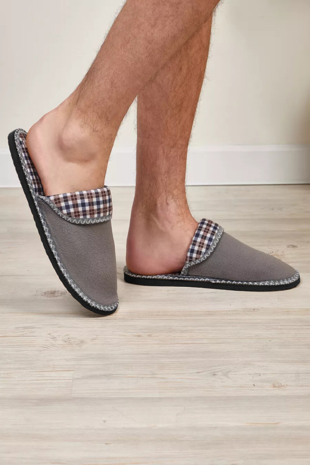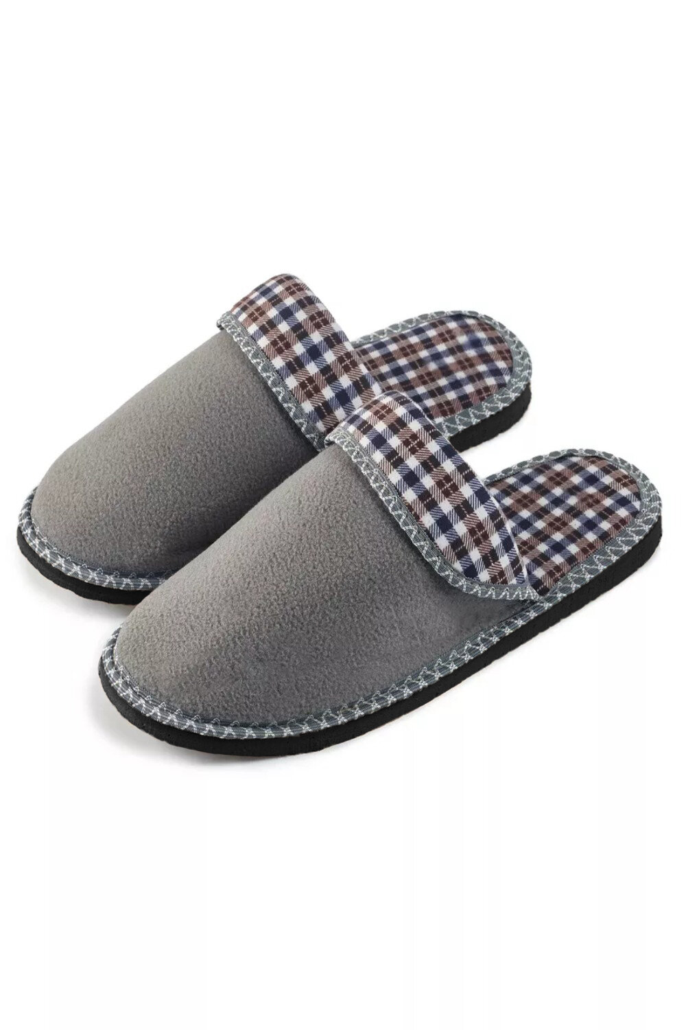 Мужские домашние тапки "LepiloV", закрытые, на текстильной стельке. Размер 39. Серый флис клетка сине-коричневая.