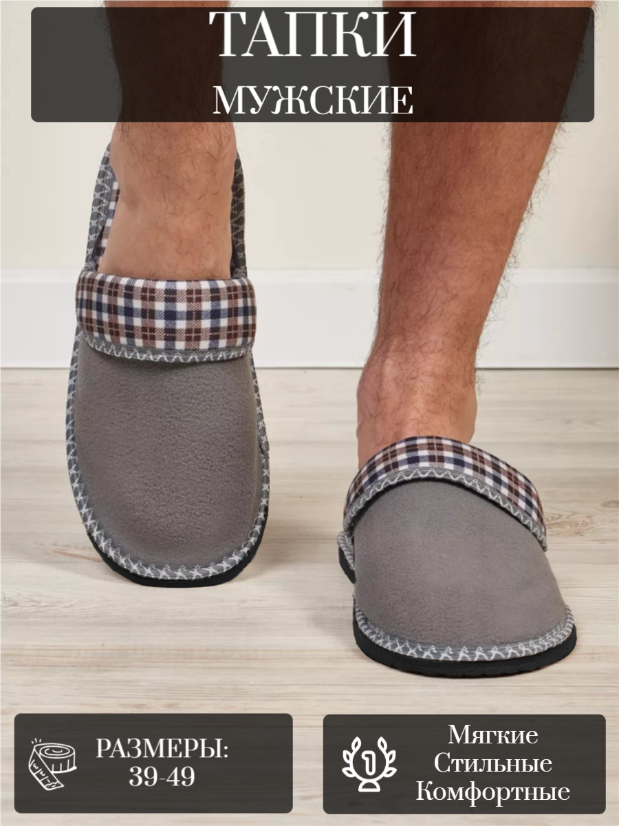 Мужские домашние тапки "LepiloV", закрытые, на текстильной стельке. Размер 42. Серый флис клетка сине-коричневая.