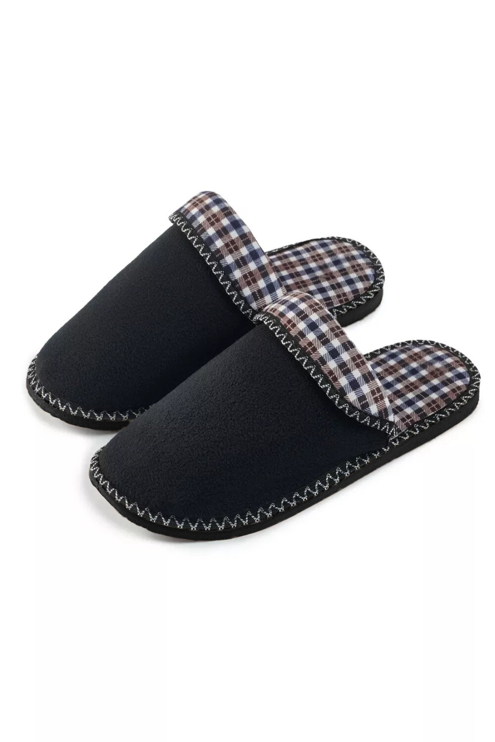 Мужские домашние тапки "LepiloV", закрытые, на текстильной стельке. Размер 44. Чёрный флис клетка сине-коричневая.