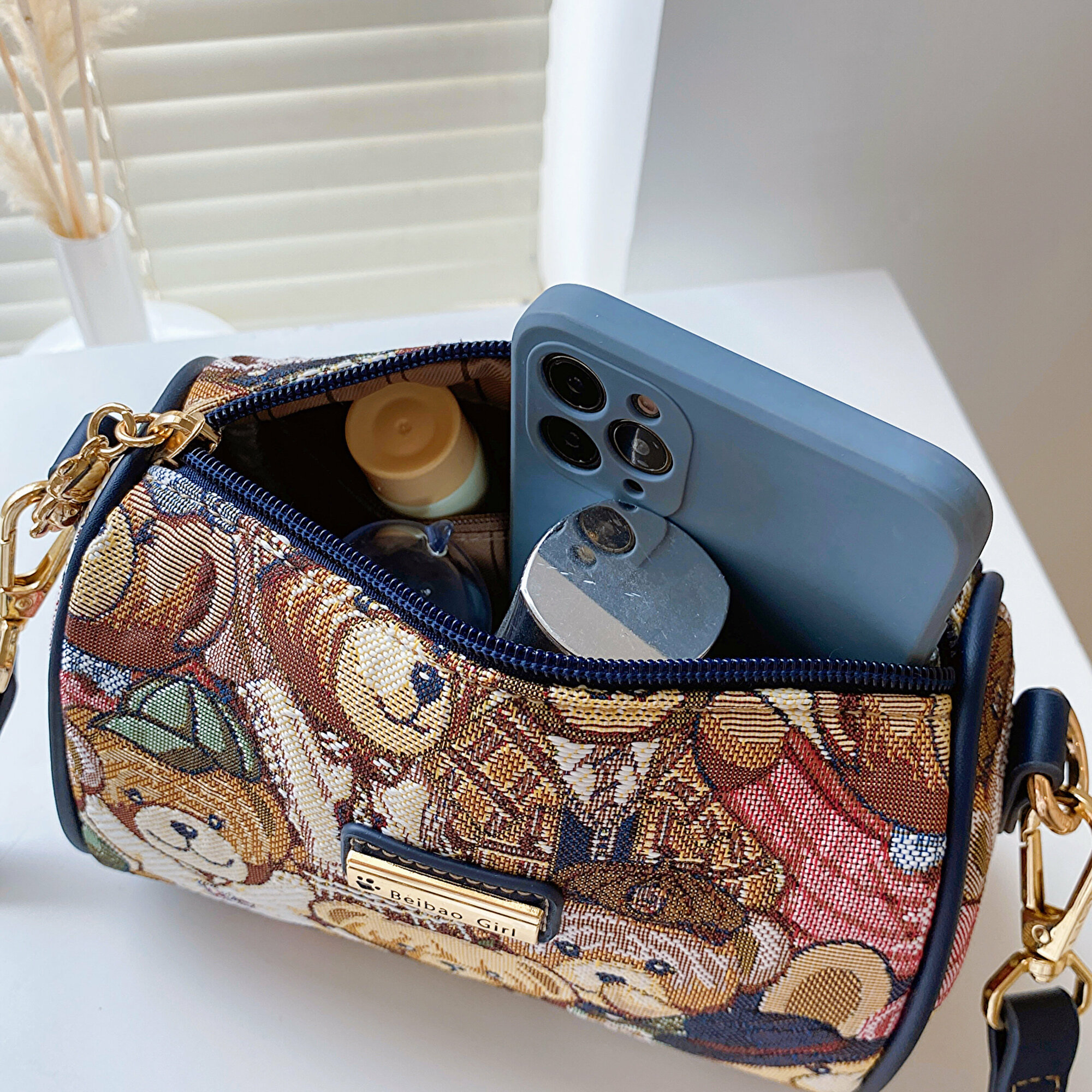 Сумка через плечо женская маленькая, бочонок с мишками