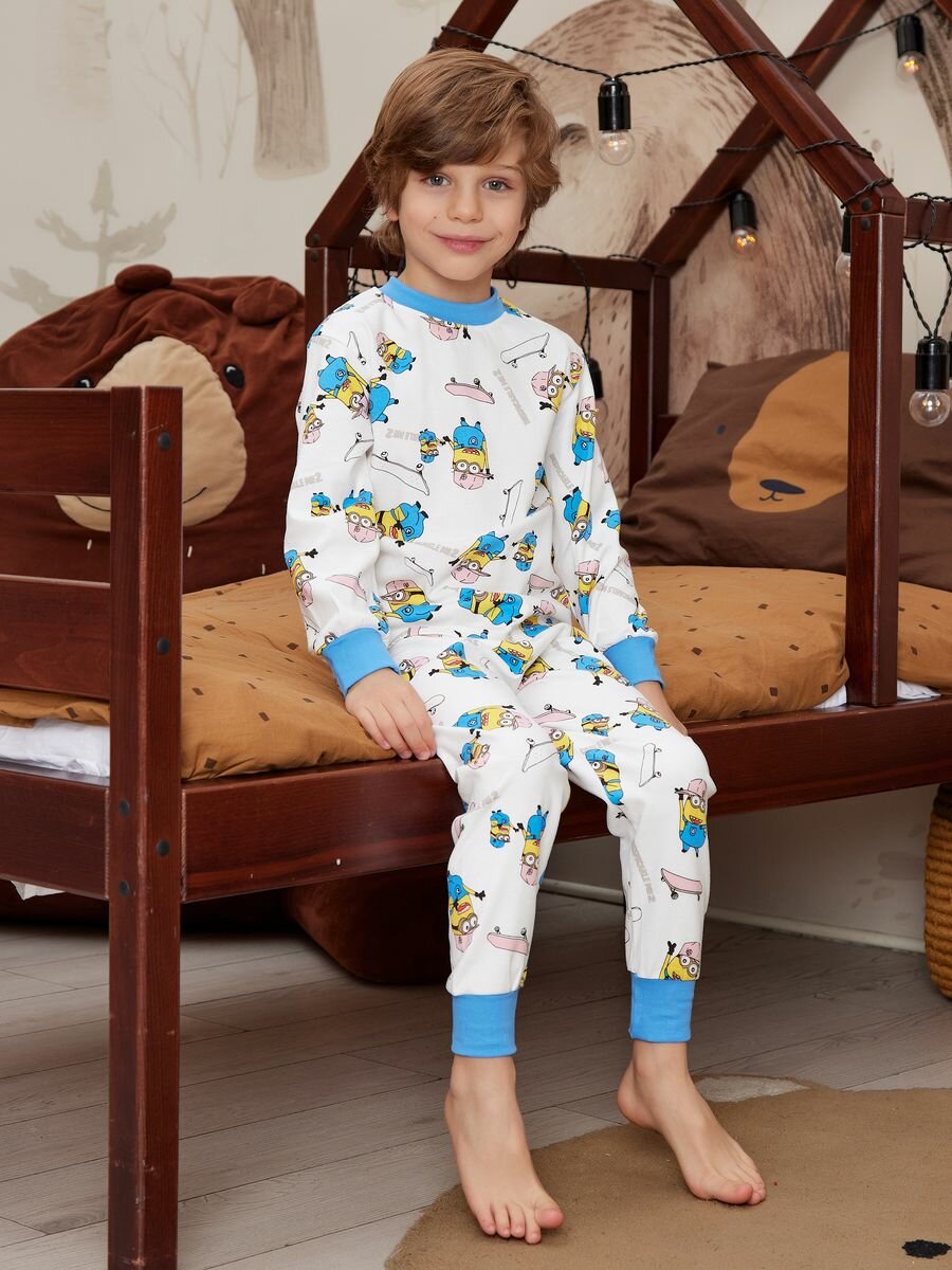 Пижама Fonuters для мальчиков, брюки, лонгслив с манжетами, Хлопок, Миньен, размер 90-100, белый, голубой