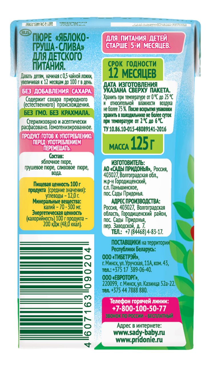 Ниже Вы можете прочитать отзывы на Пюре фруктовое сады придонья Яблоко, груша, слива, с 5 месяцев, 125г, ознакомится с подробными характеристиками, посмотреть интересные обзоры и фотографии на Пюре фруктовое сады придонья Яблоко, груша, слива, с 5 месяцев, 125г.