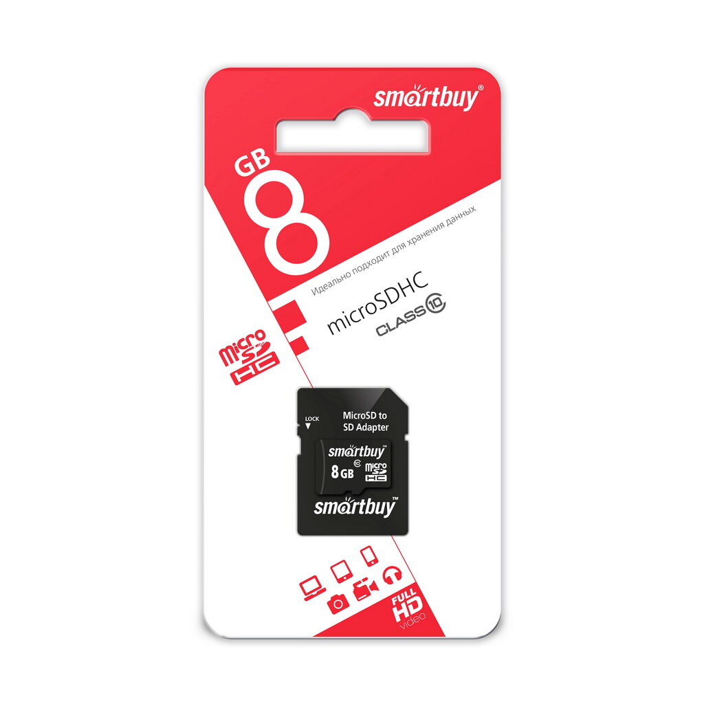 Карта памяти microSDHC SmartBuy 8Gb, Class 10, 10Мб/сек (с адаптером SD), 1шт. (SB8GBSDCL10-01)
