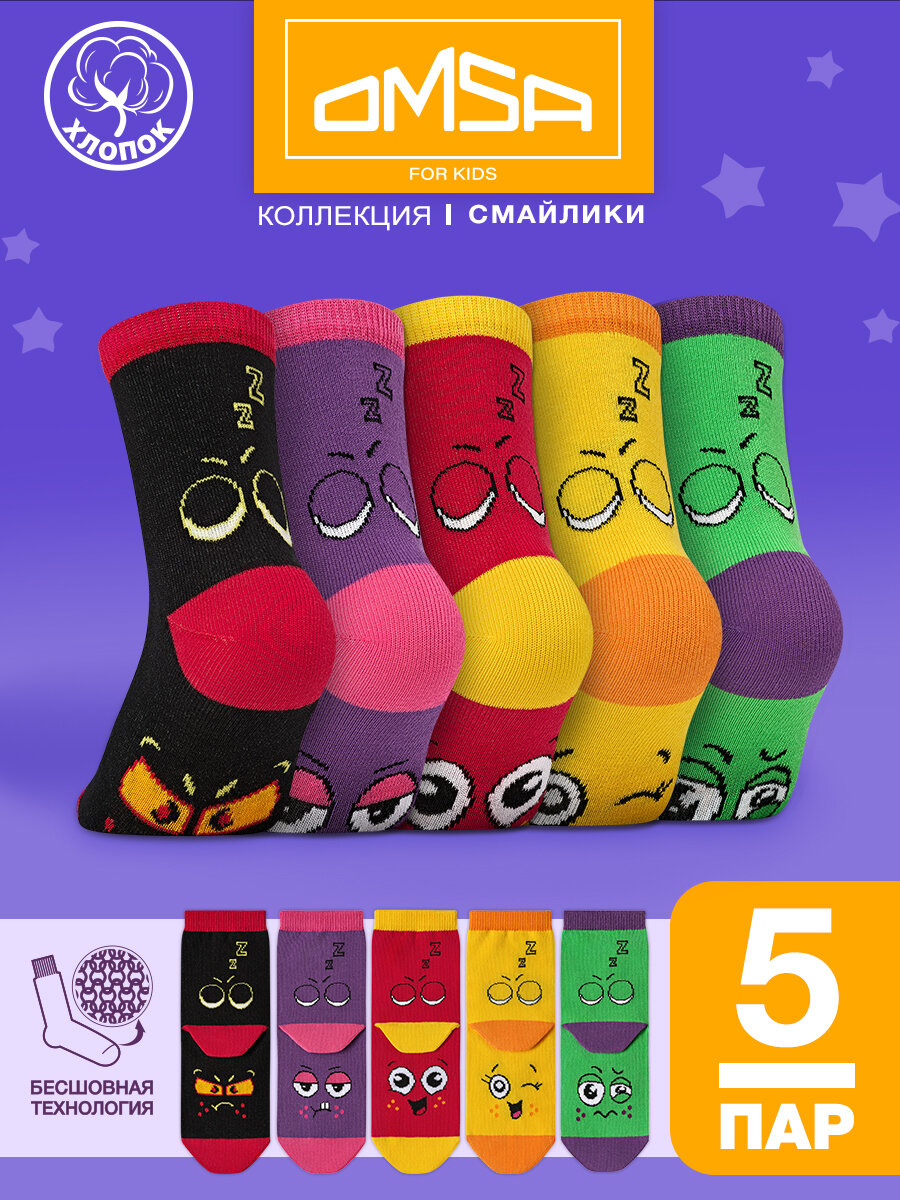 Носки детские OMSA kids Calzino 21P42, набор 5 пар, с рисунком "Смайлики" цвет Мультиколор размер 19-22