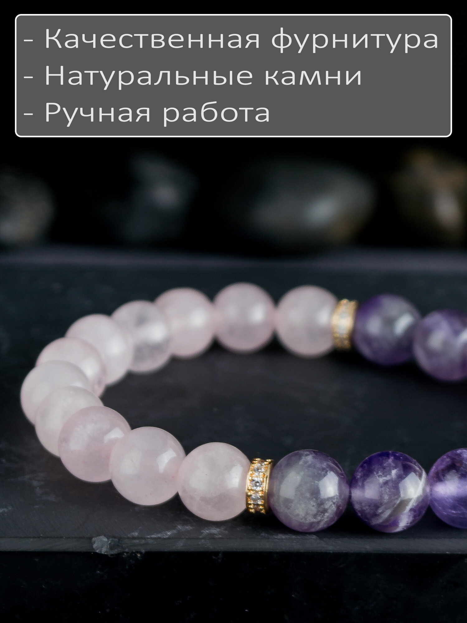 Браслет из аметиста и розового кварца 8 мм