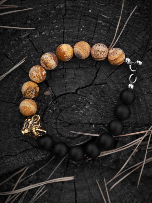 Кицунэ - браслет мужской / женский из натуральных камней ( яшма и оникс ) с бусиной из бронзы в виде лисы, размер 21-24