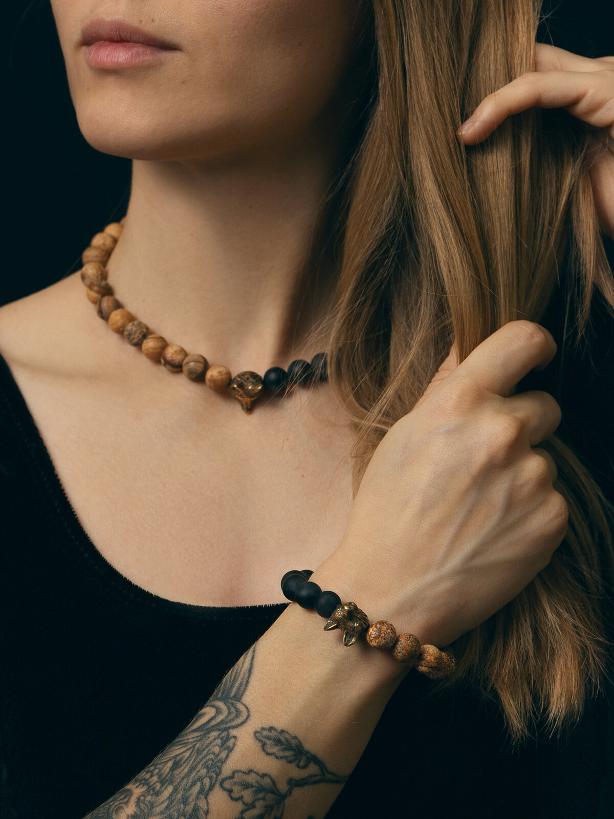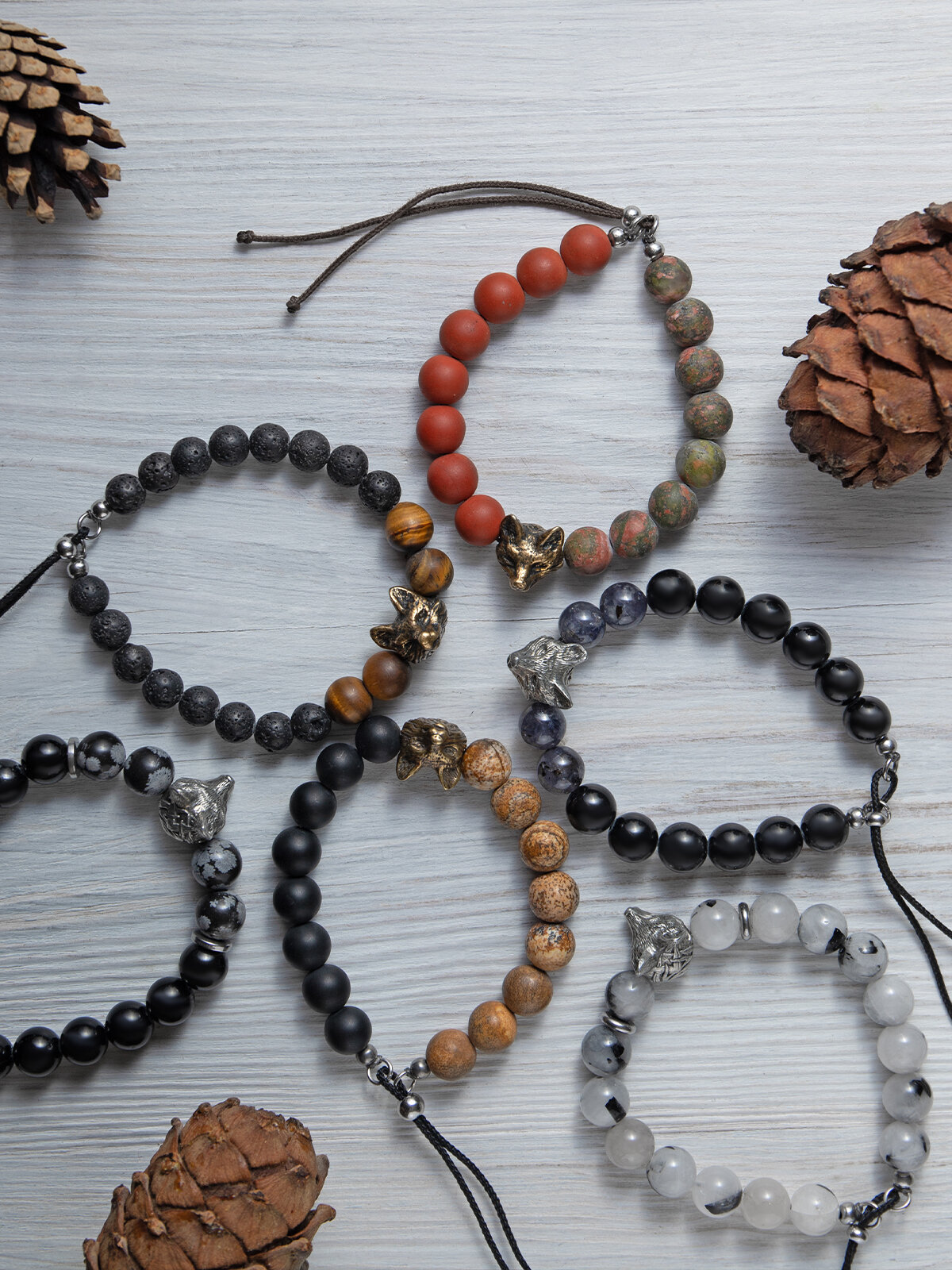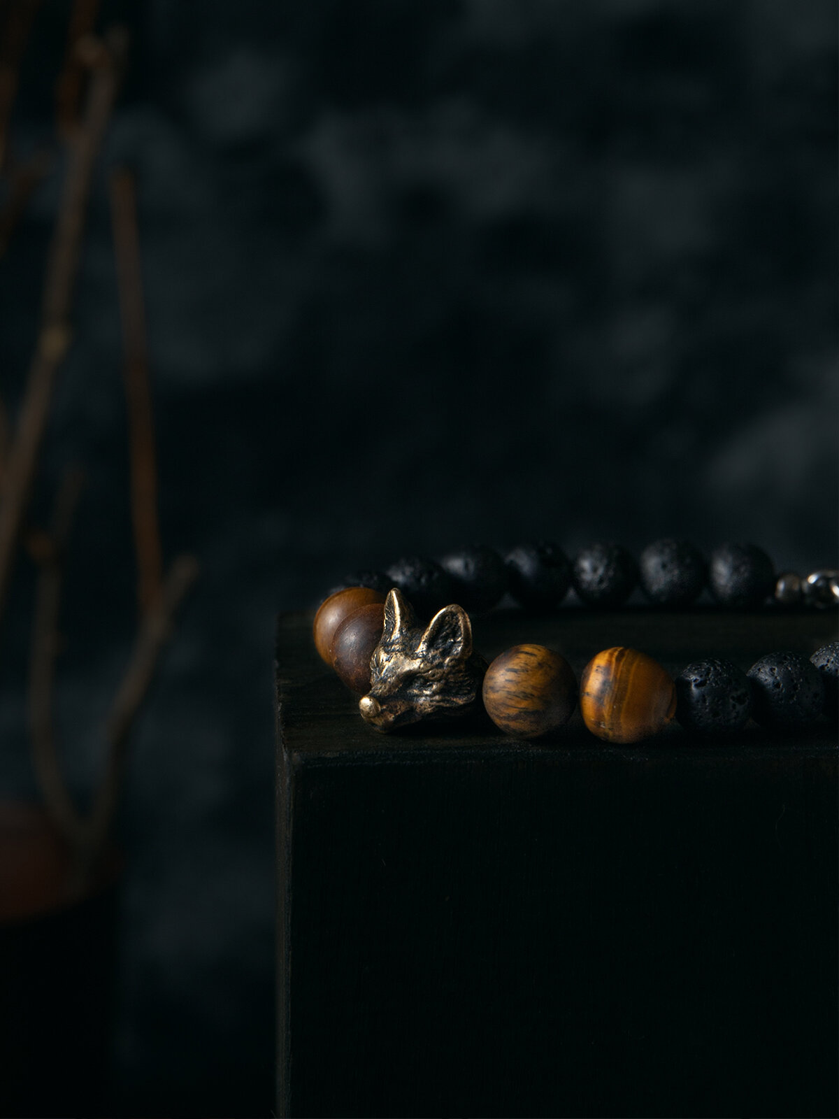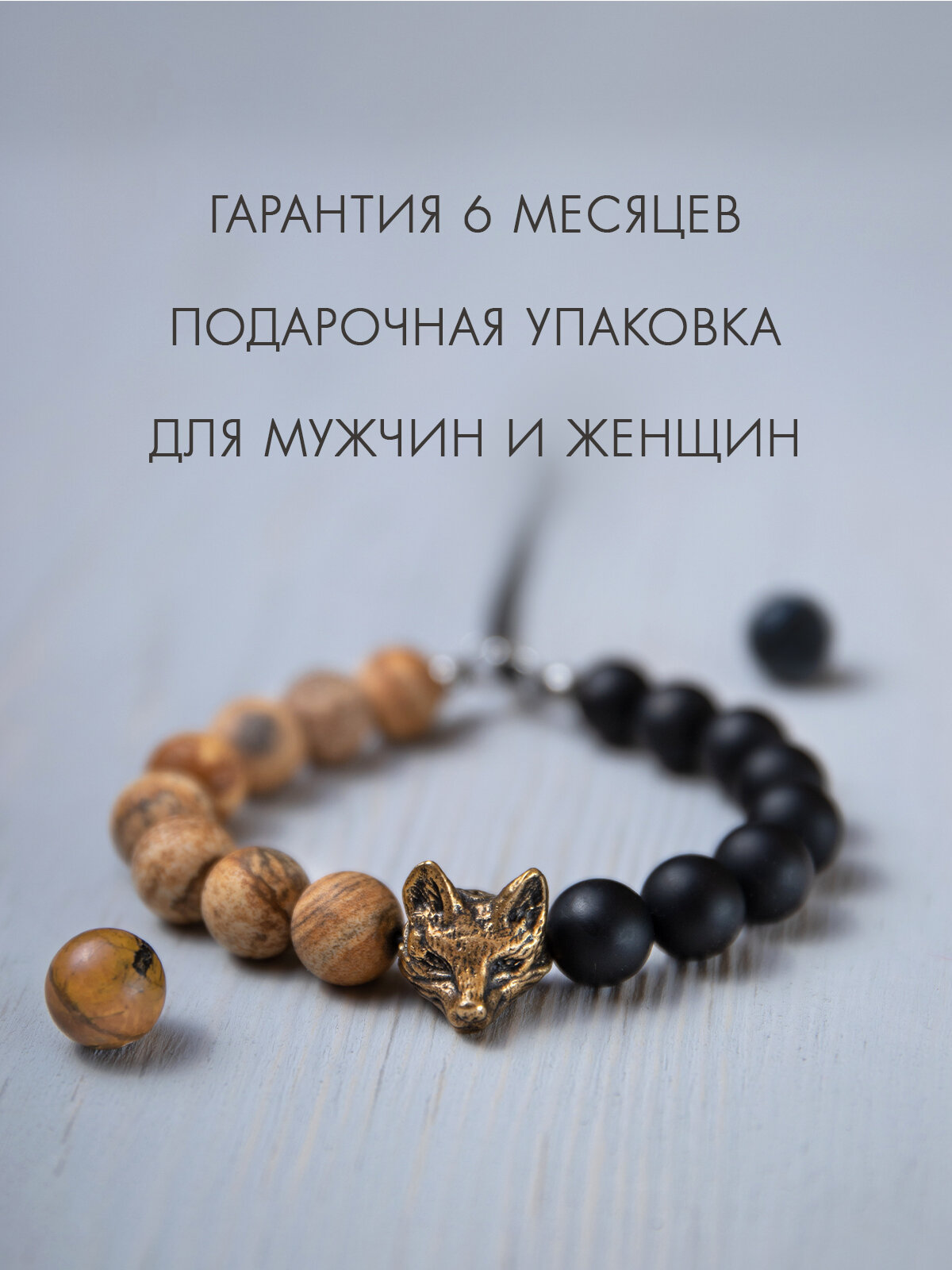 Кицунэ- браслет мужской / женский из натуральных камней ( яшма и оникс ) с бусиной из бронзы в виде лисы, размер 15-17,5