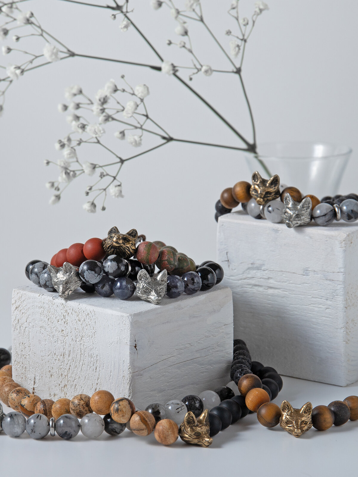Кицунэ - браслет мужской / женский из натуральных камней ( яшма и оникс ) с бусиной из бронзы в виде лисы, размер 18-20,5