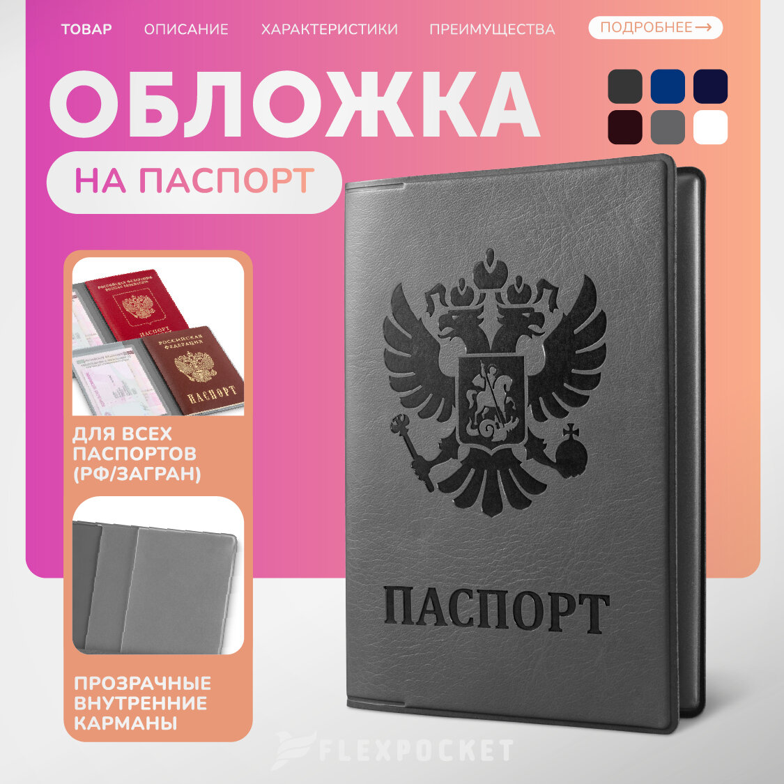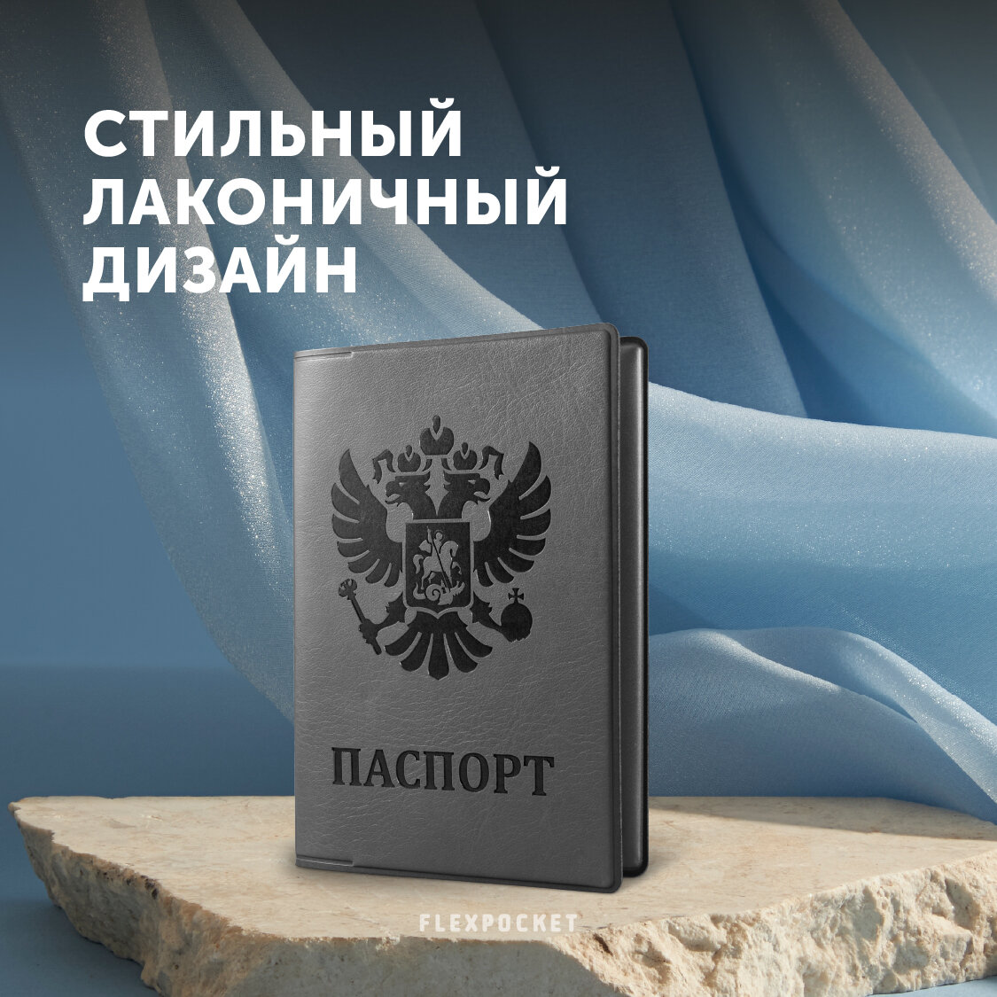 Обложка для паспорта Flexpocket из экокожи classic с дополнительными отделениями для документов (СТС, снилс, права), цвет серый с гербом