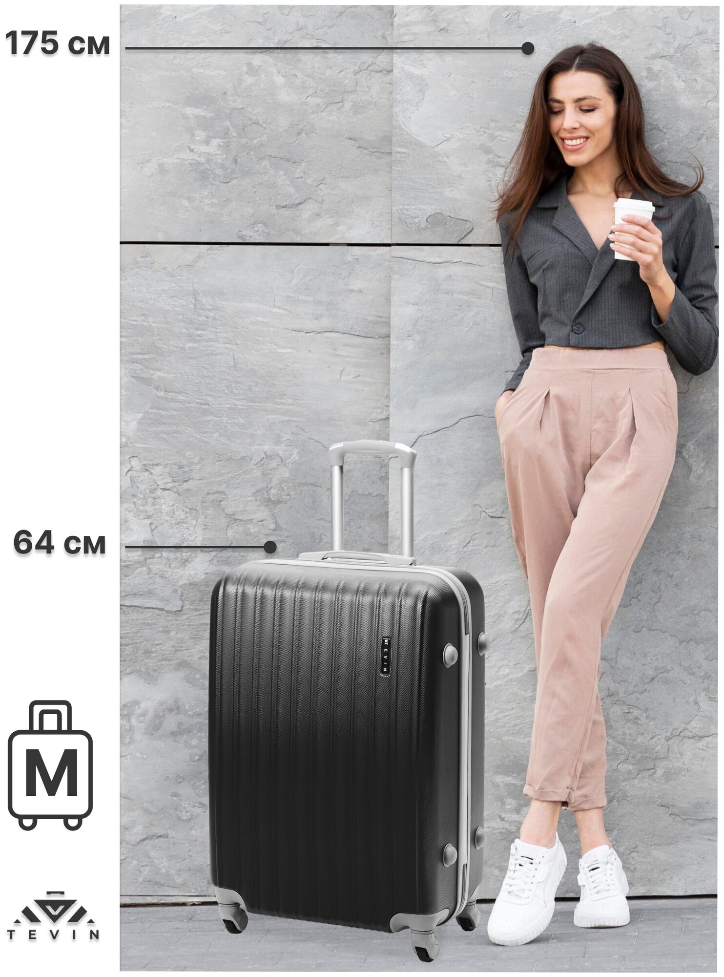 Чемодан на колесах TEVIN размер М черный графитовый