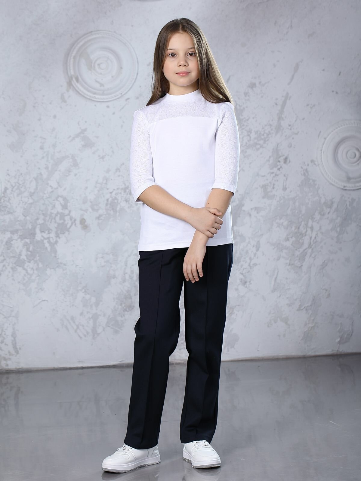 Блузка школьная для девочки, белая, кружевная, трикотажная, 146