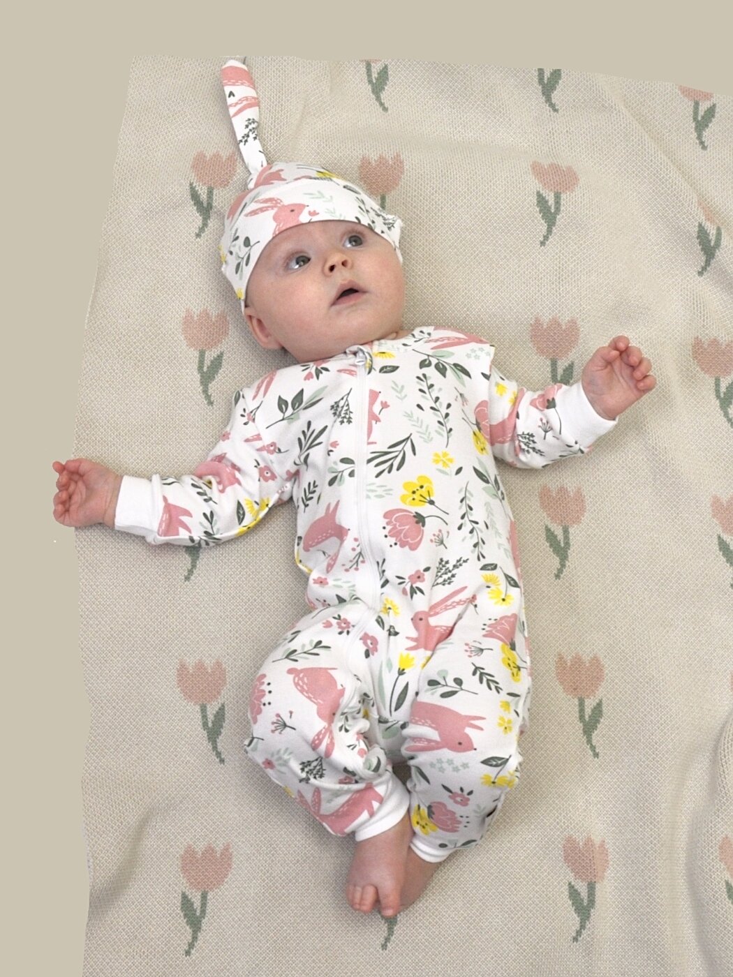Комбинезон нательный слип на молнии Bebo для новорожденных малышей, мальчиков и девочек, зайчики в цветах, 68 см.