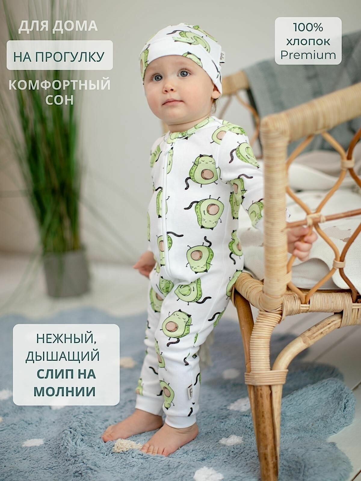 Комбинезон слип детский Bebo нательный на молнии для новорожденных малышей, авокадо-котики, 68 см.