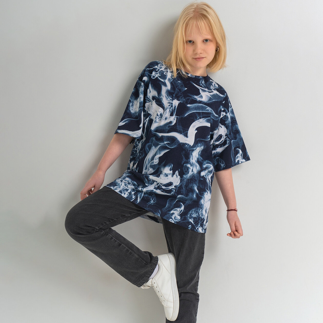 Детская футболка оверсайз для девочки HappyFox, HF0178SP размер 134, цвет дым.на.т.синем