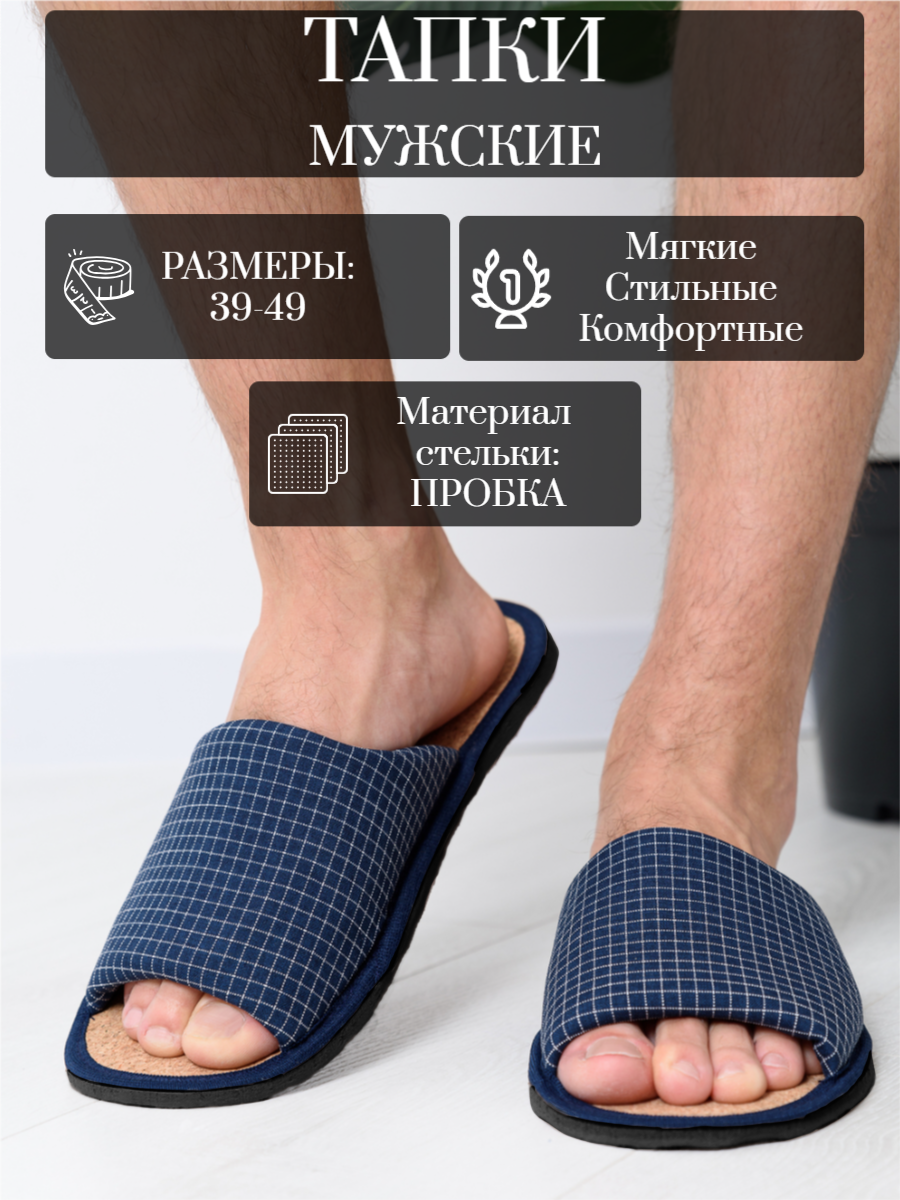 Мужские домашние тапки "LepiloV", открытые, на пробковой стельке. Размер 39. Синяя клетка.