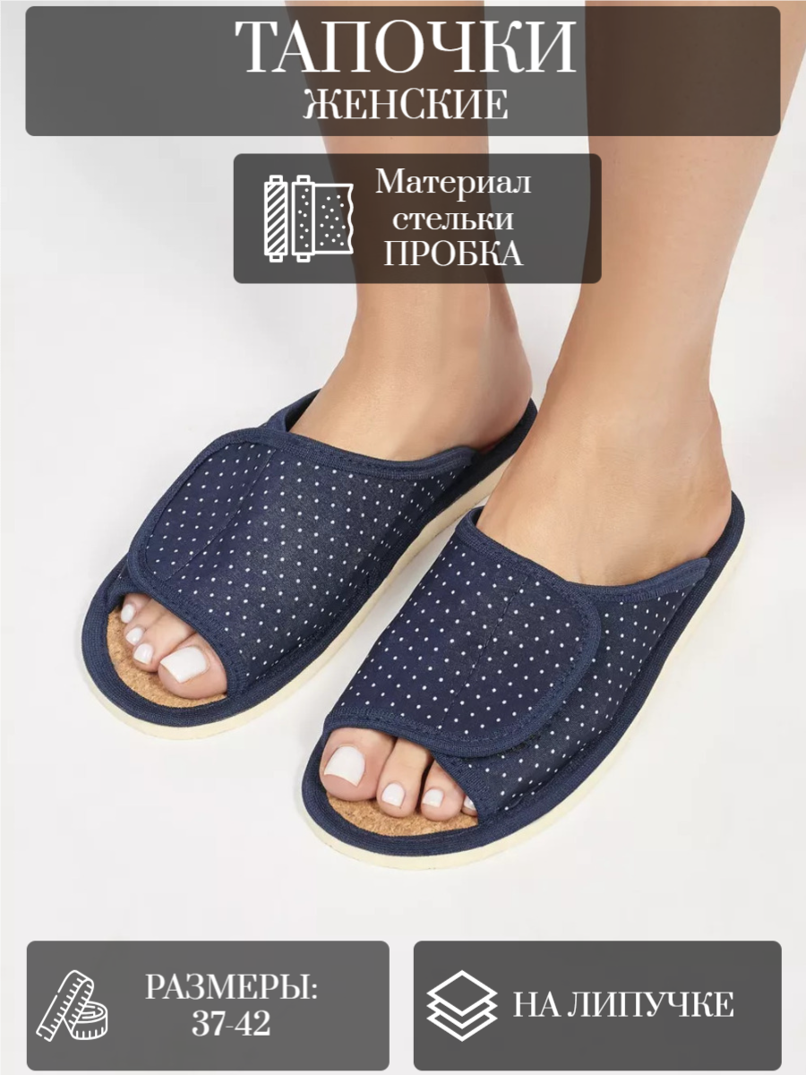 Женские домашние тапочки "LepiloV", открытые, на пробковой стельке и липучке. Размер 37. Синий горох, цветы.
