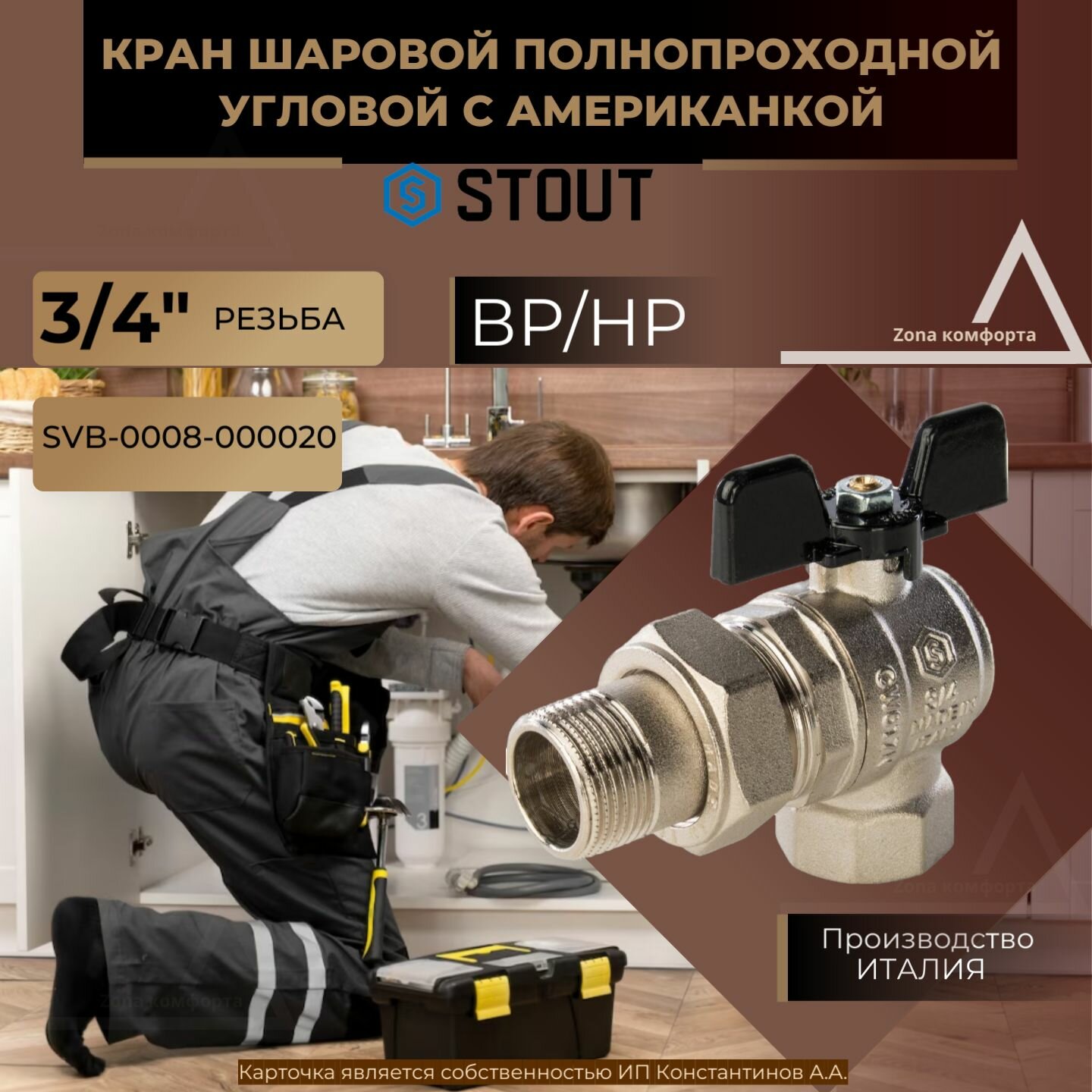 Кран шаровой с американкой угловой ф3/4'' Stout бабочка (SVB-0008-000020)
