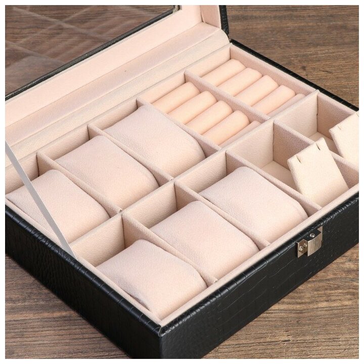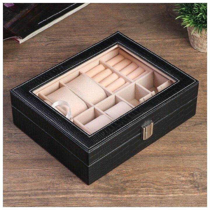 Шкатулка большая двухуровневая для хранения 10 часов, 5 очков и украшений CloxBox W119 Черная