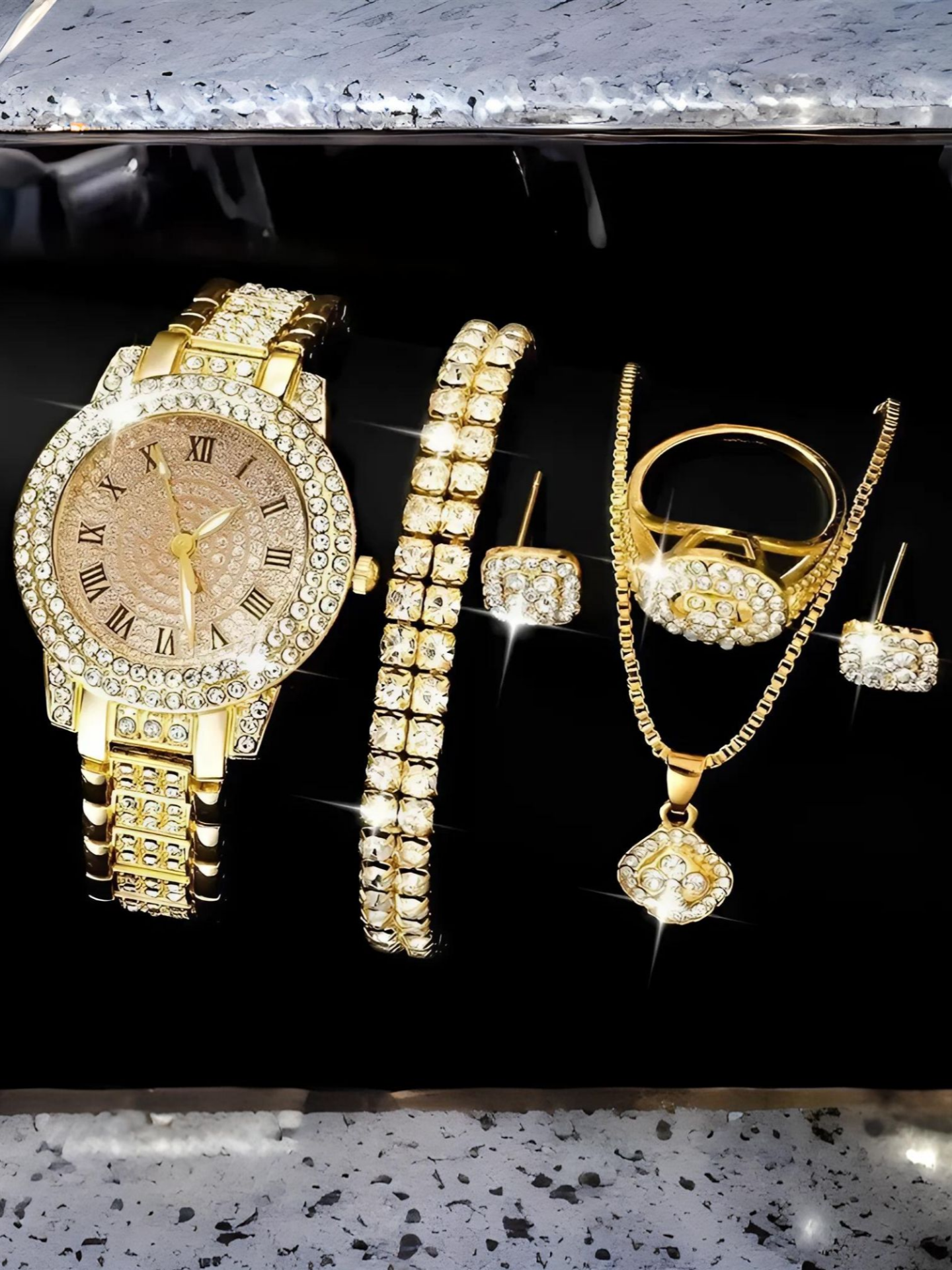 | Комплектация | В комплект входит: -1 х наручные часы, -2 х серьги, -1 х ожерелье, -1 х кольцо, -1 х браслет |