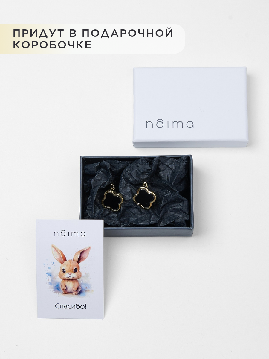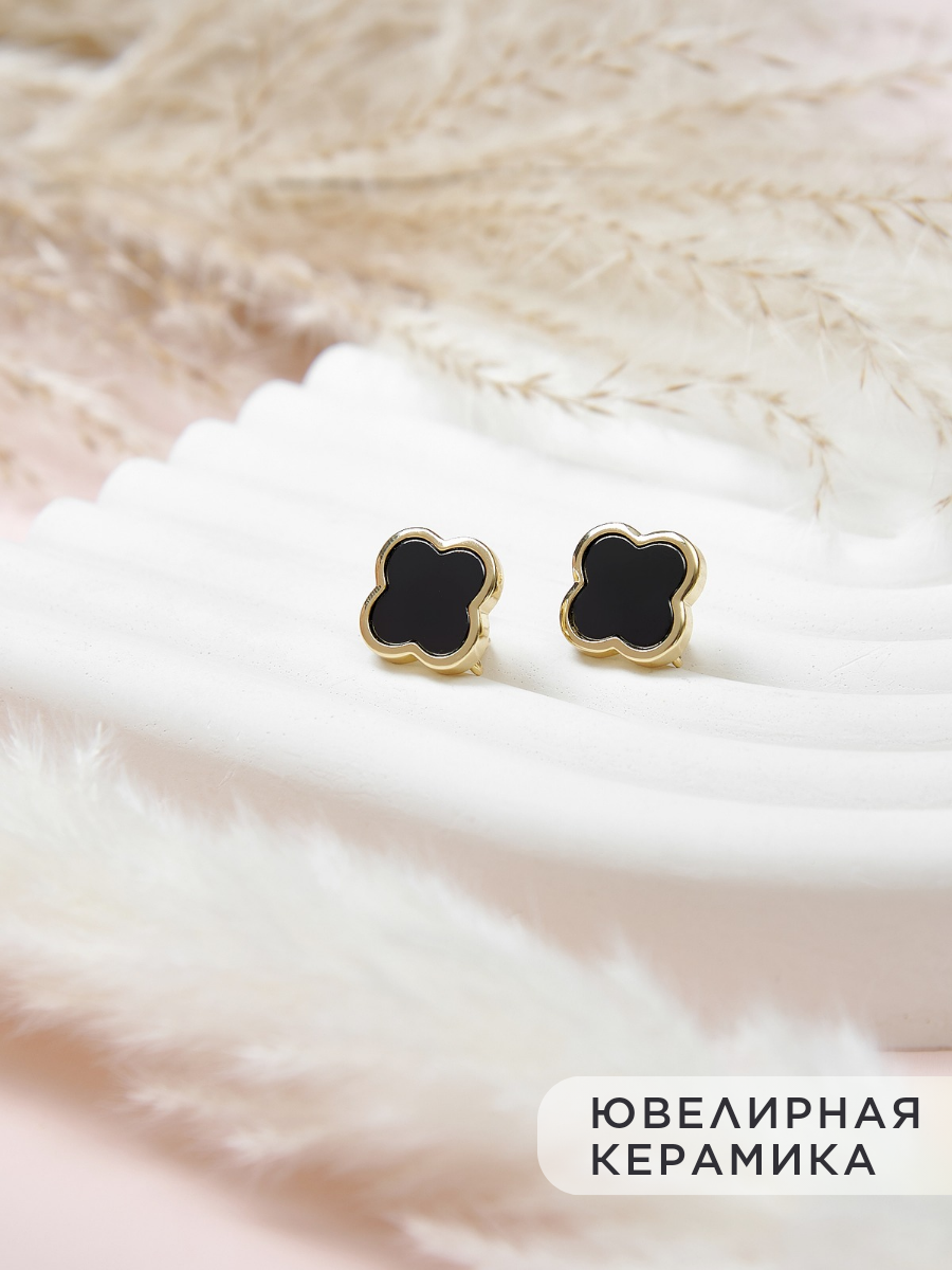 Серьги клевер со вставкой черная керамика женские NOIMA