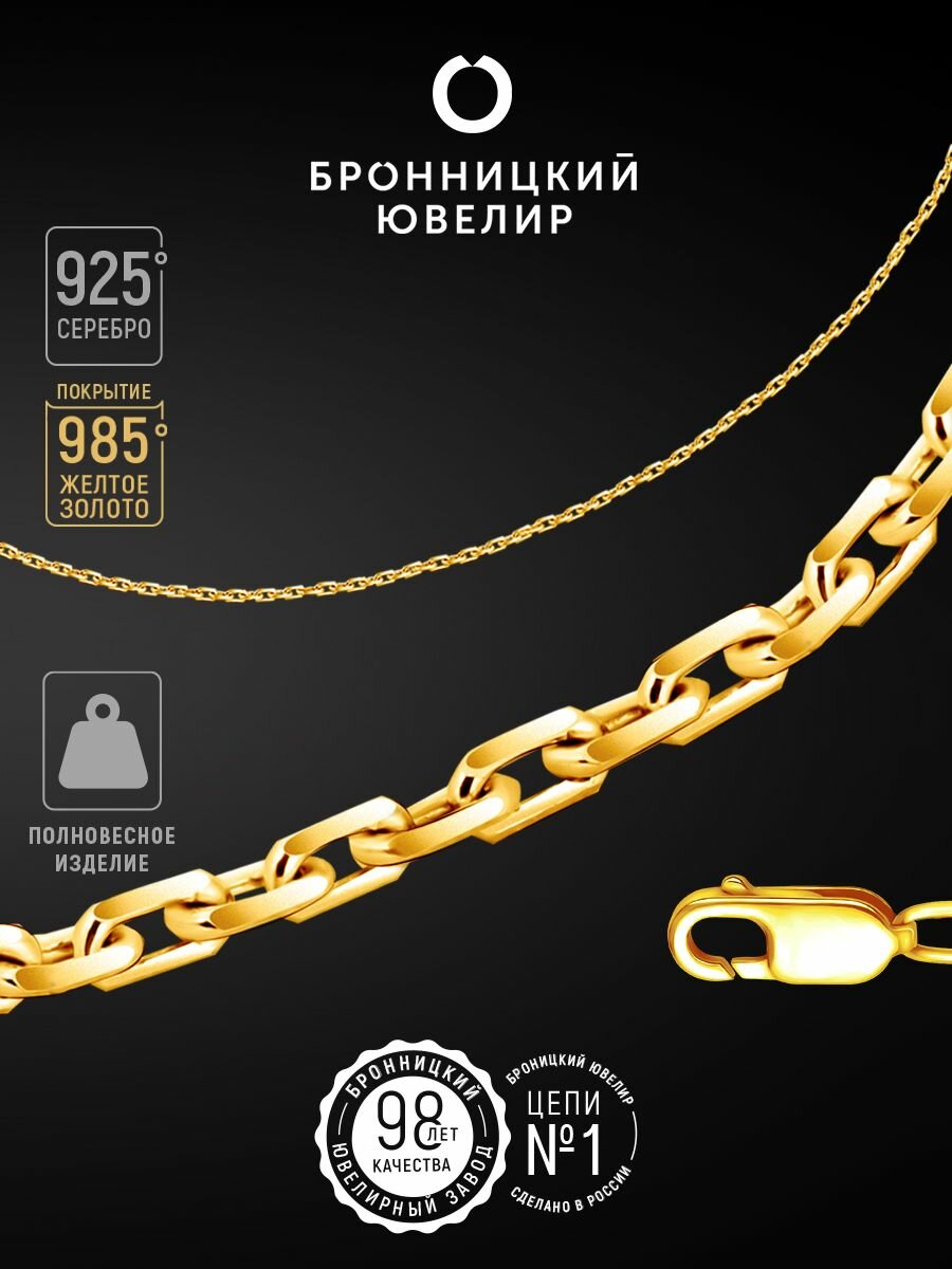 Цепь Бронницкий Ювелир, серебро, 925 проба, золочение, длина 50 см, средний вес 7.52 г, , желтый, золотистый