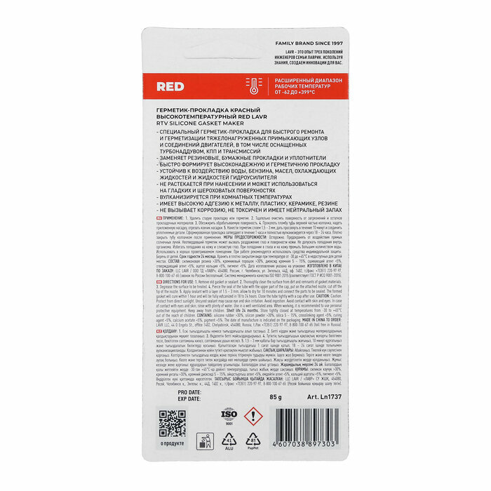 | Подробная комплектация | Герметик-прокладка красный высокотемпературный Red, 85 г LAVR - 1шт |