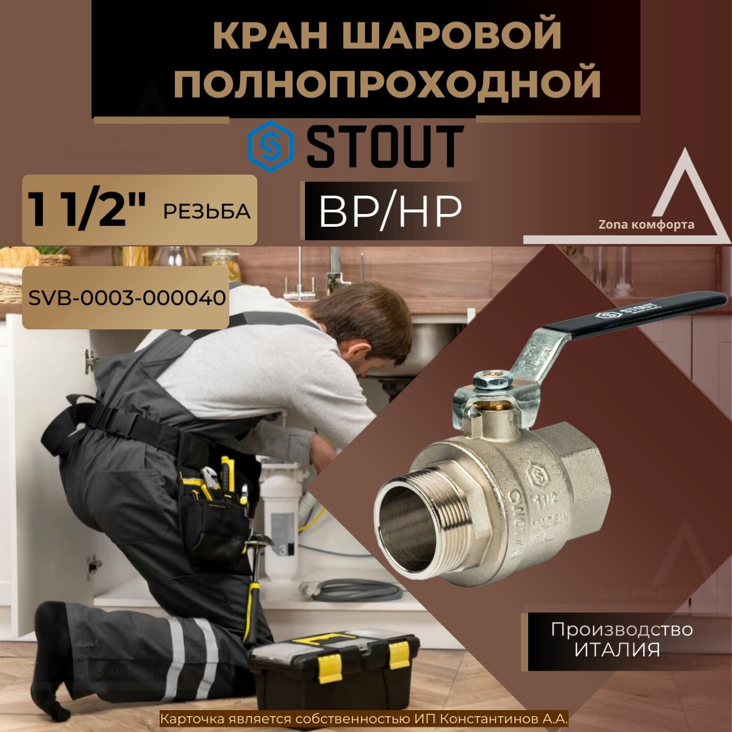 SVB-0003-000040 STOUT Кран шаровой полнопроходной, ВР/НР, ручка рычаг 1 1/2