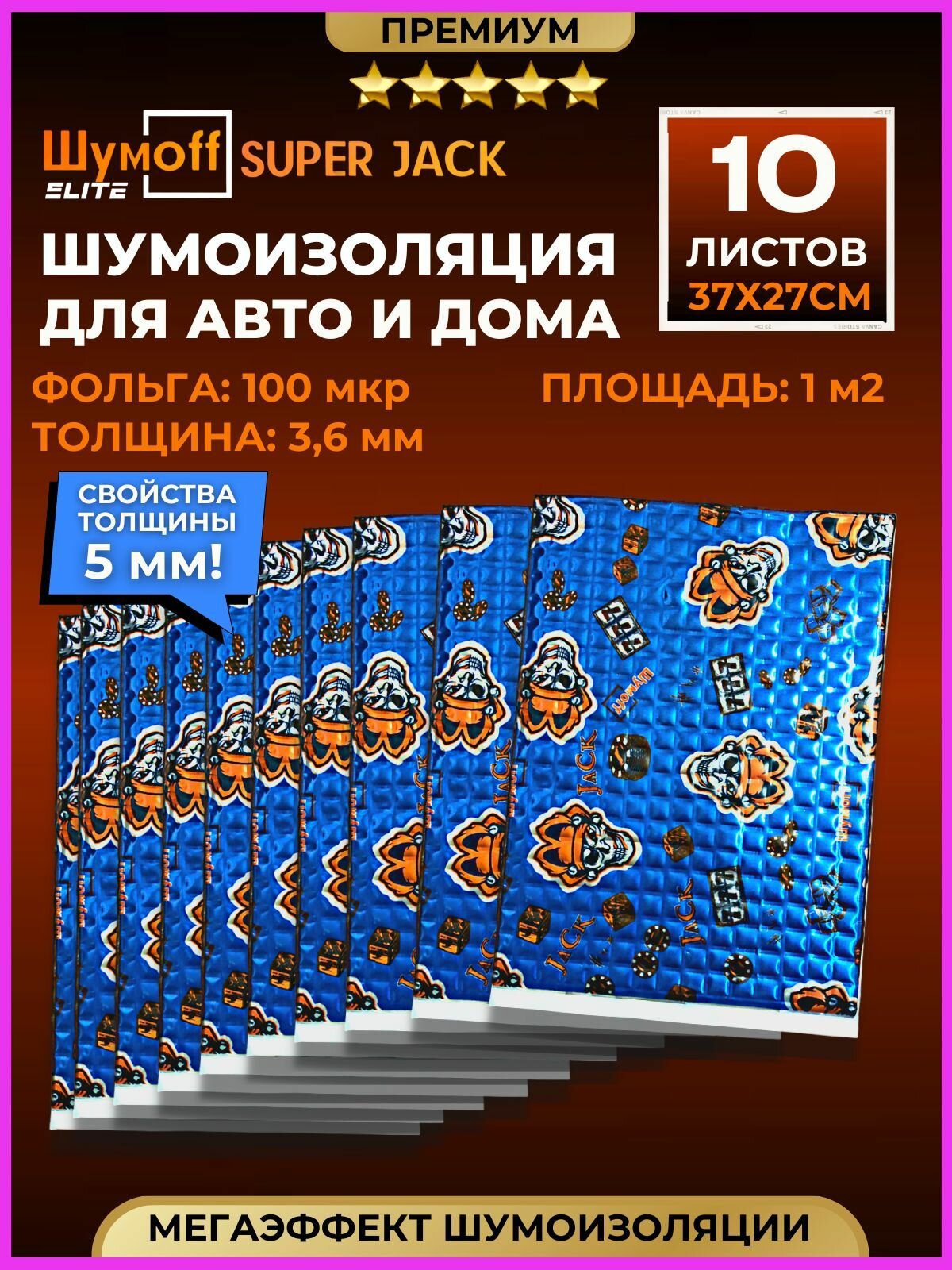 Шумоизоляция для автомобиля Шумофф Джек 10 листов. Толщина 2 мм = 3 мм. Виброизоляция авто, вибропласт, вибродемпфер, шумка в машину. Шумоизоляция для дверей, крыши, потолка, капота, локеров. Звукоизоляция в авто Шумоff Jack. Шумоизоляция ванны, отлива