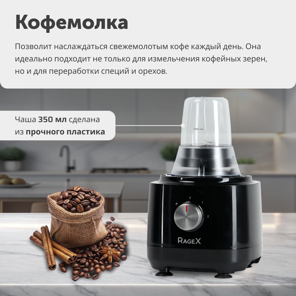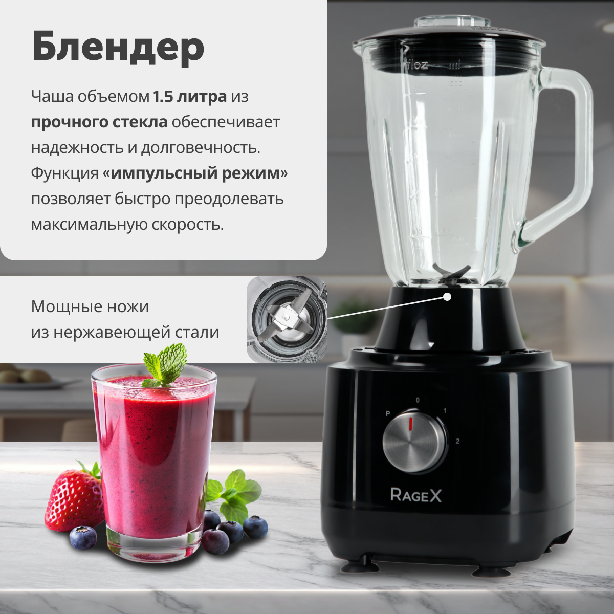 | Подробная комплектация | Кухонный комбайн RageX R101 для дома - 1 шт., крюк для теста - 1 шт., плоский битер для перемешивания - 1 шт., венчик для взбивания - 1 шт., чаша металлическая - 1 шт., чаша блендер - 1 шт., мясорубка с решетками - 1 шт., режущие лезвия - 4 шт., металлический лоток для мясорубки - 1 шт., инструкция по использованию кухонного комбайна с мясорубкой - 1 шт; упаковка - 1 шт. |