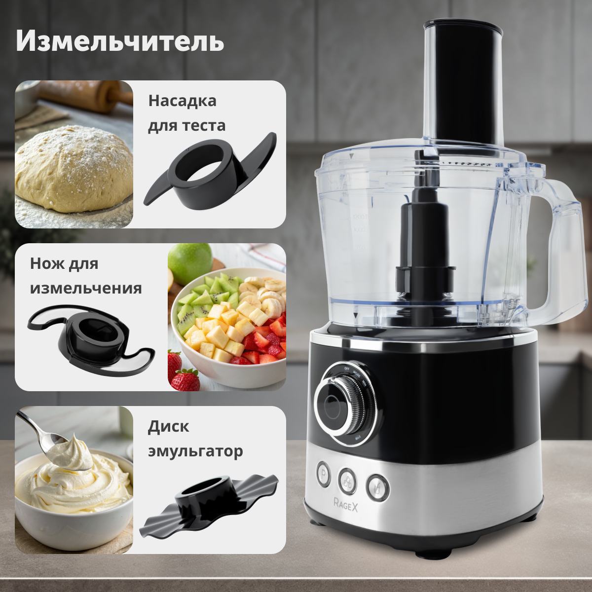Кухонный комбайн 12 в 1, объем 1.2 литра, 2 скорости, мощность 1000 Вт, черный