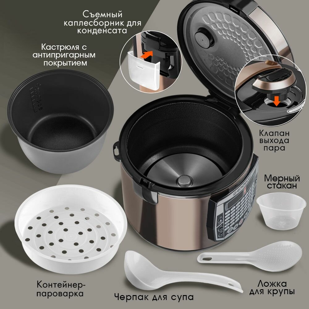 | Подробная комплектация | Мультиварка, Съемный каплесборник для конденсата, Клапан выпуска пара, Съемная чаша, Контейнер-пароварка, Черпак для супа, Ложка для крупы, Мерный стакан, Шнур питания, Руководство по эксплуатации, Книга рецептов, Гарантийный талон |