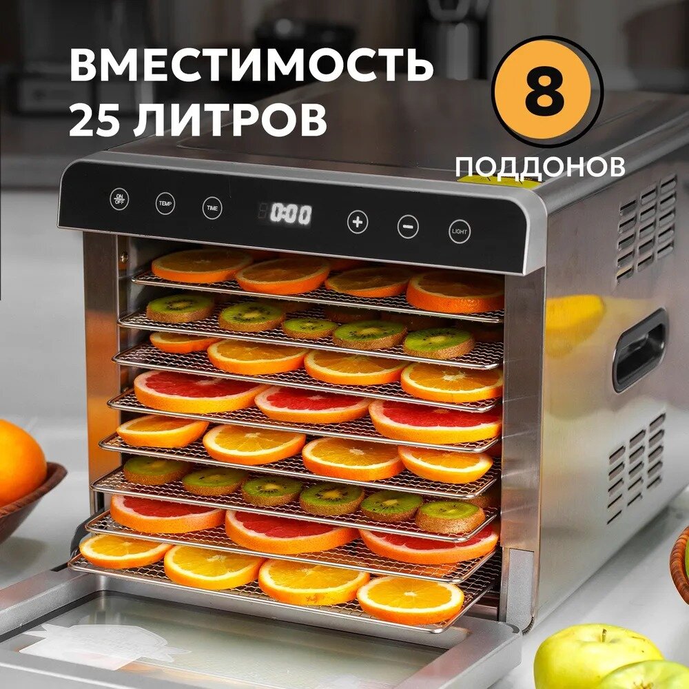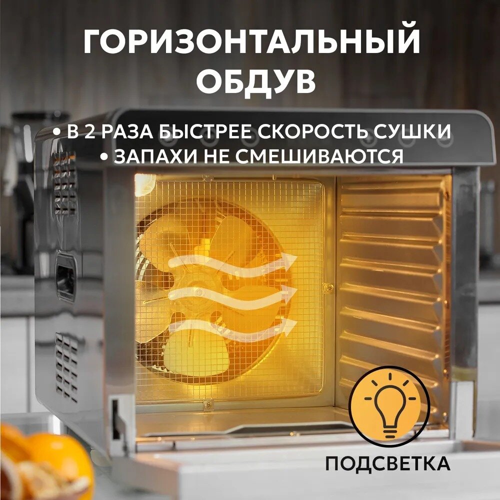 | Дополнительная информация | Дегитратор, инструкция, книга рецептов, 8 металлических сеток+2 с мелкой сеткой для ягод, 1 поддон для крошек |