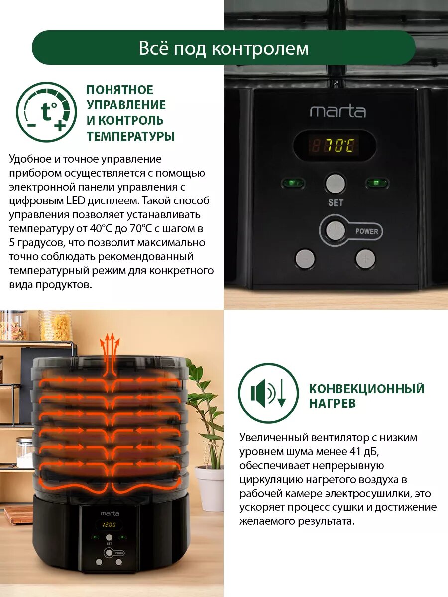 Дегидратор сушилка для овощей электросушилка MARTA MT-FD1886H 12 поддонов (6 основных + 3 для пастилы + 3 для ягод) черный жемчуг интересное: