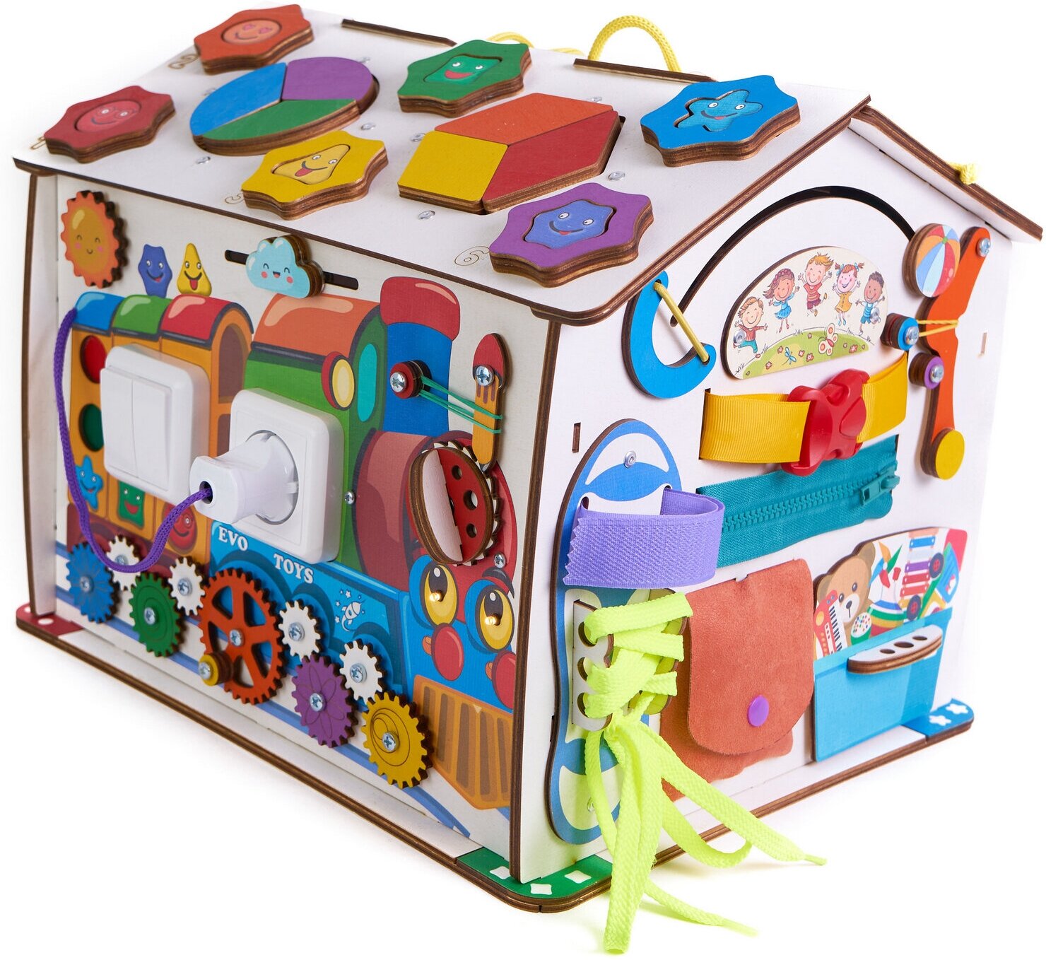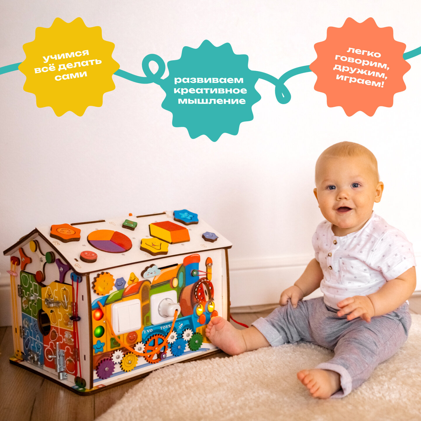 Бизиборд Evotoys развивающий Домик Смайлики на паровозике со светом