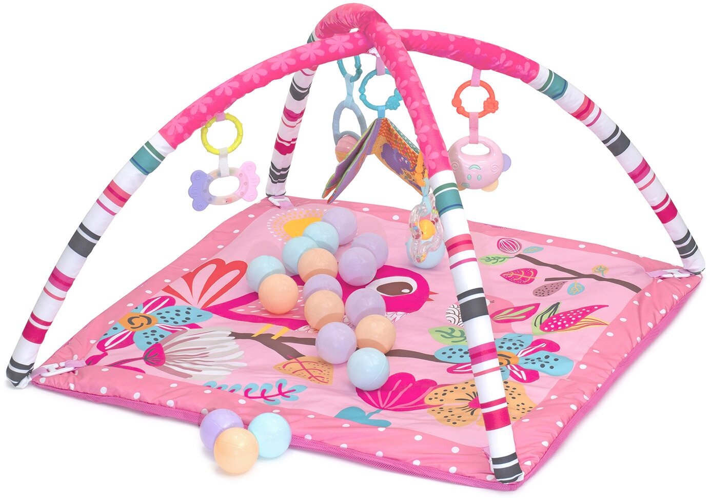 | Комплектация | коврик / две игровые дуги с 5 съемными игрушками (3 пластиковые погремушки / безопасное зеркальце и шуршащая с изображениями животных книжечка с пищалкой) / 18 пластмассовых шариков / сетка-манеж |