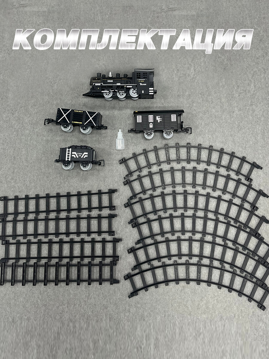 Железная дорога с поездом на батарейках и вагонами с паром, светом и звуком