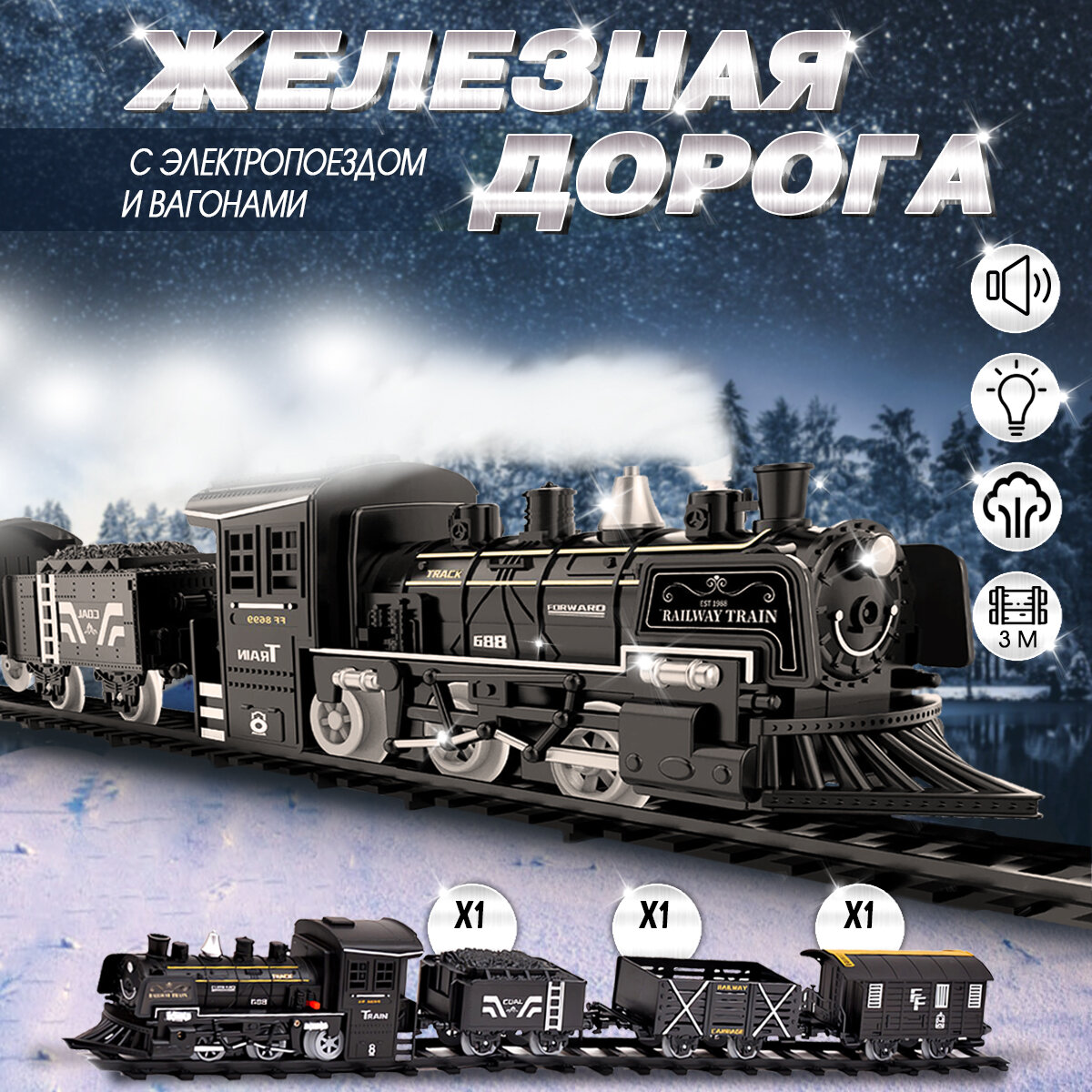 Железная дорога с поездом на батарейках и вагонами со светом, паром и звуком