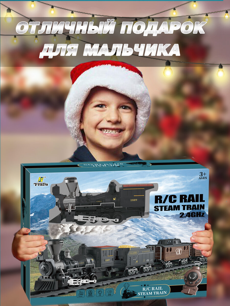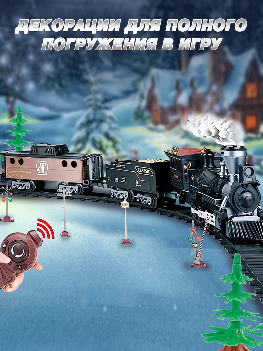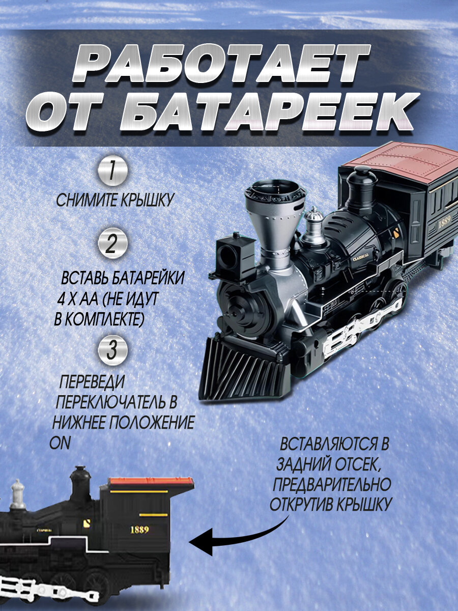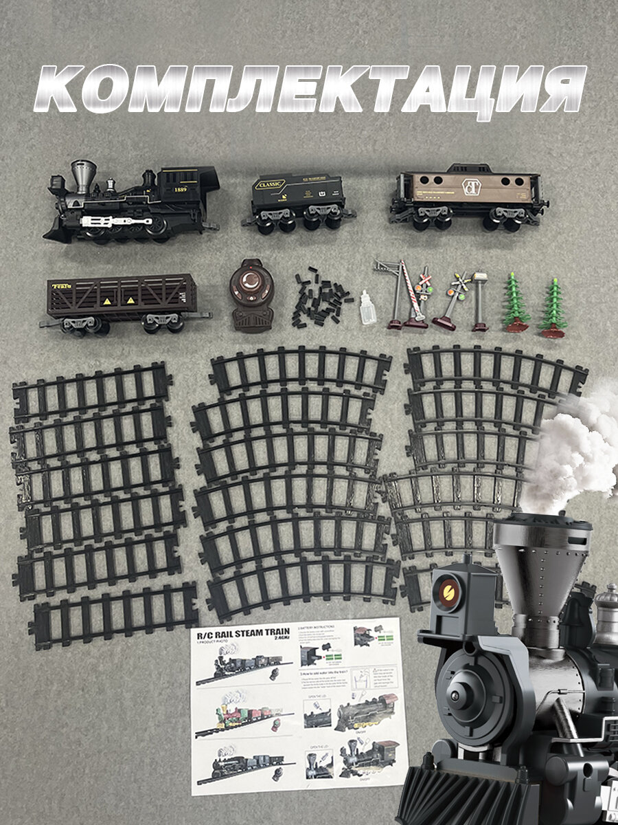 Железная дорога с поездом на батарейках и вагонами с паром, светом и звуком