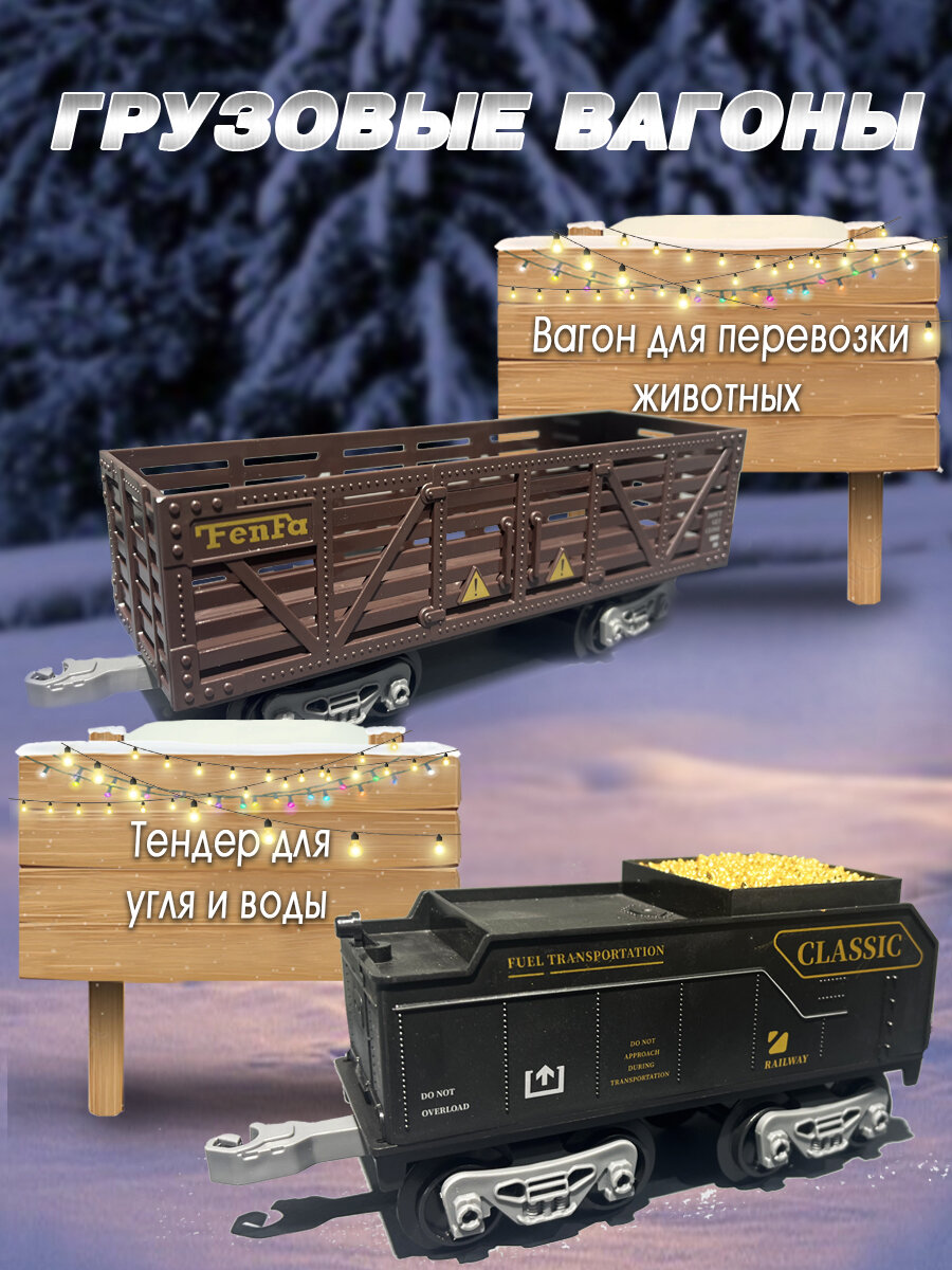 Железная дорога с поездом на батарейках и вагонами со светом, звуком и паром