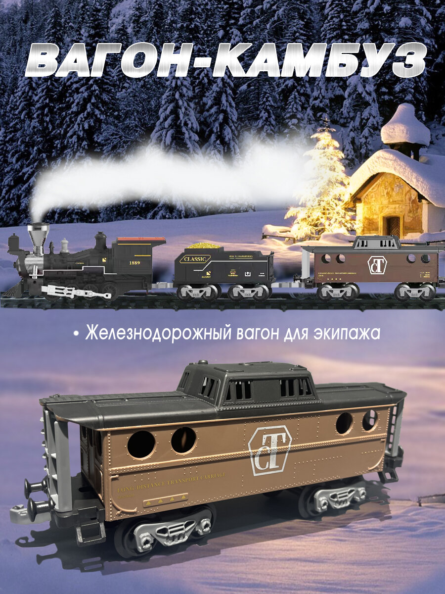 Железная дорога с поездом на батарейках и вагонами со светом, паром и звуком