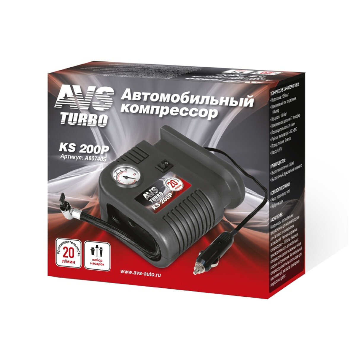 | Дополнительная информация | • Компрессор автомобильный AVS KS200P - 1шт.; • Набор насадок. |