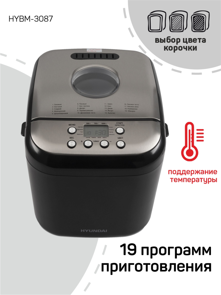 Хлебопечь HYUNDAI HYBM-3087, 1000г, 19 программ, серебристый, черная интересное: