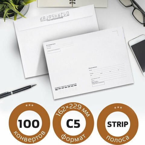 Конверты Brauberg С5, 162х229 мм, отрывная лента, Куда-Кому, внутренняя запечатка, 80 г/м2, 100 шт
