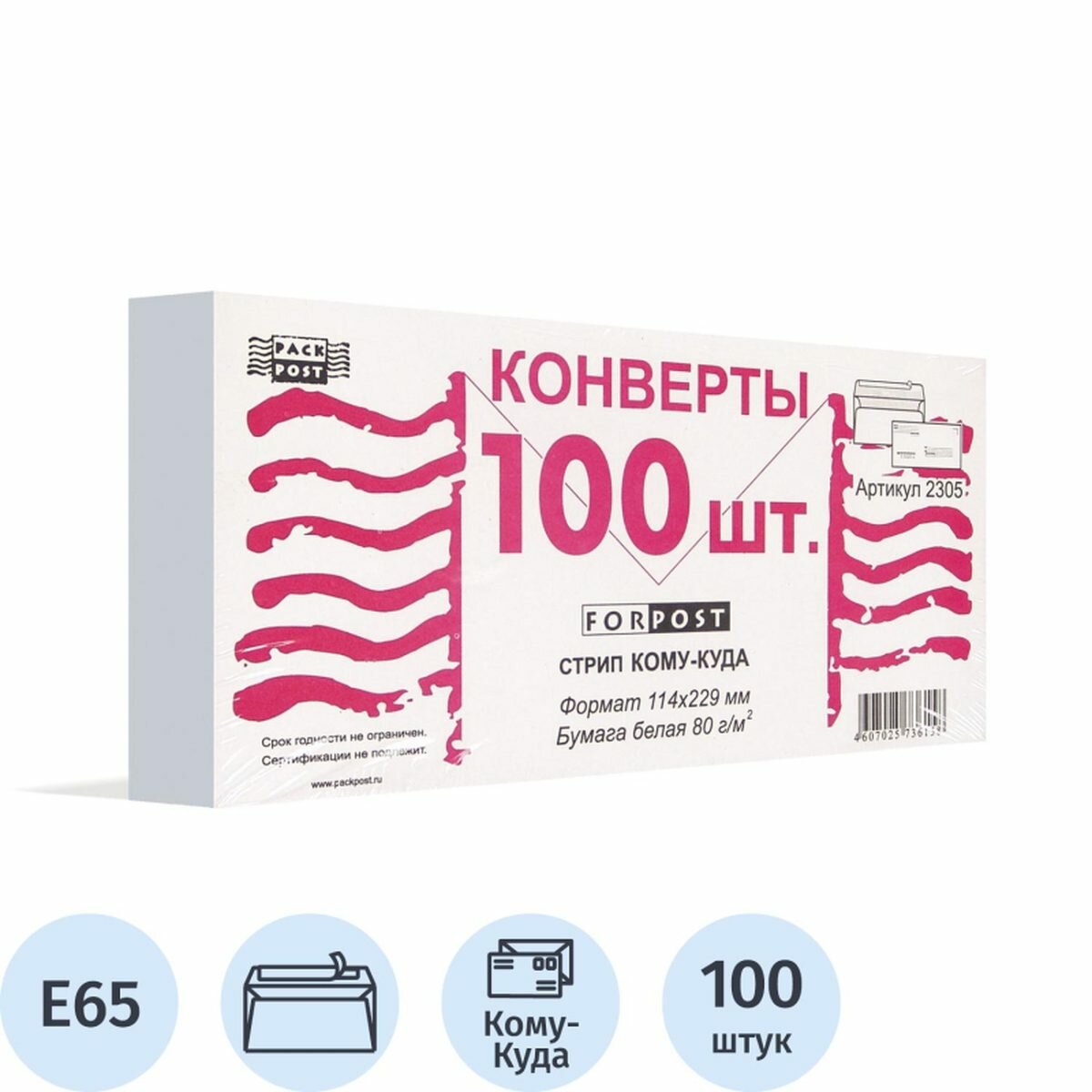 Купить Конверт почтовый E65 Packpost ForPost (110x220мм, 80г, отрывная лента, печать "Куда-Кому") 100шт, 12 уп.