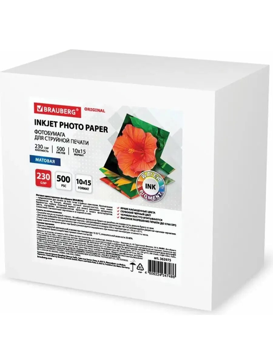 Фотобумага Brauberg матовая, 10х15 см, 230 г/м2, односторонняя, 500 листов, original (363975)