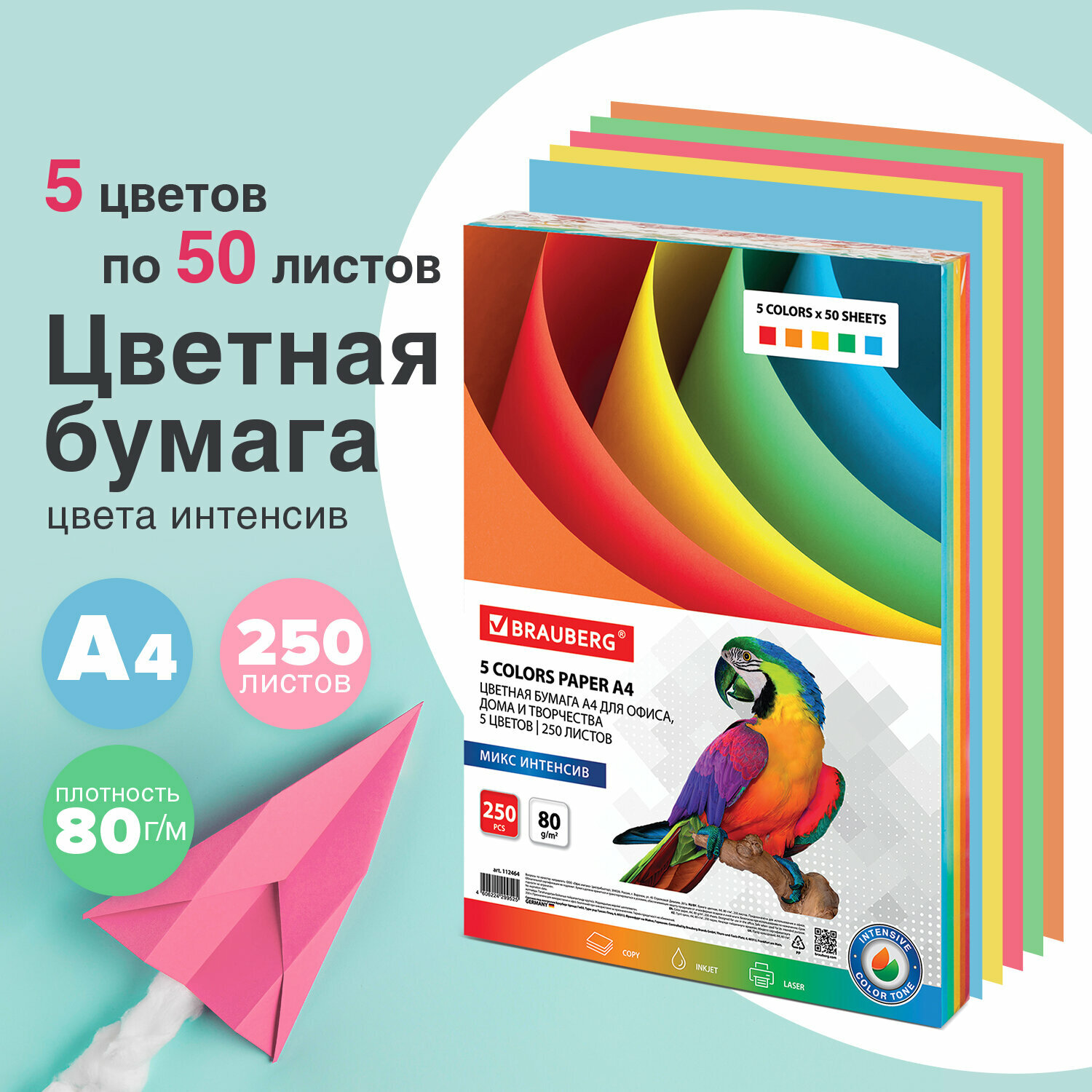 Бумага цветная BRAUBERG, А4, 80 г/м2, 250 л., (5 цветов х 50 л.), интенсив, для офисной техники, 112464