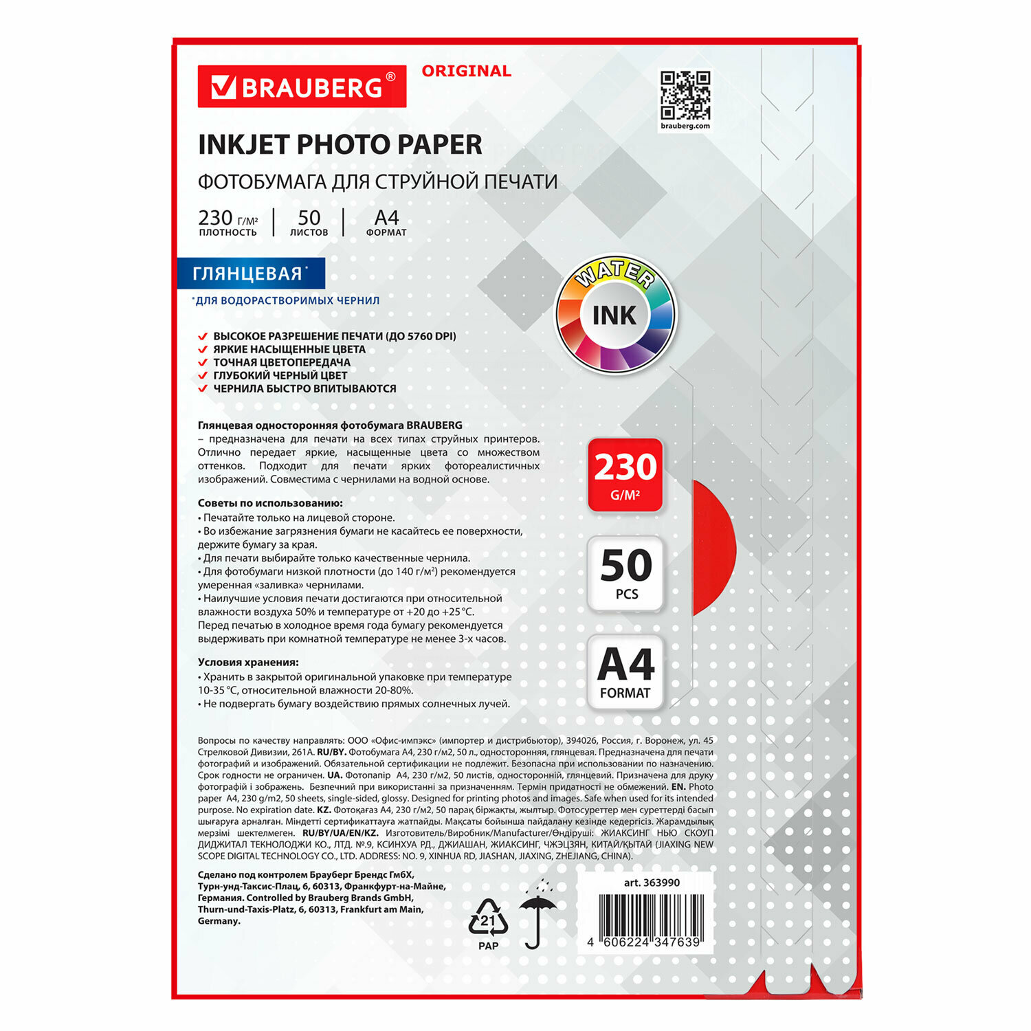 Фотобумага глянцевая, А4, 230 г/м2, односторонняя, 50 листов, BRAUBERG ORIGINAL, 363990 интересное: