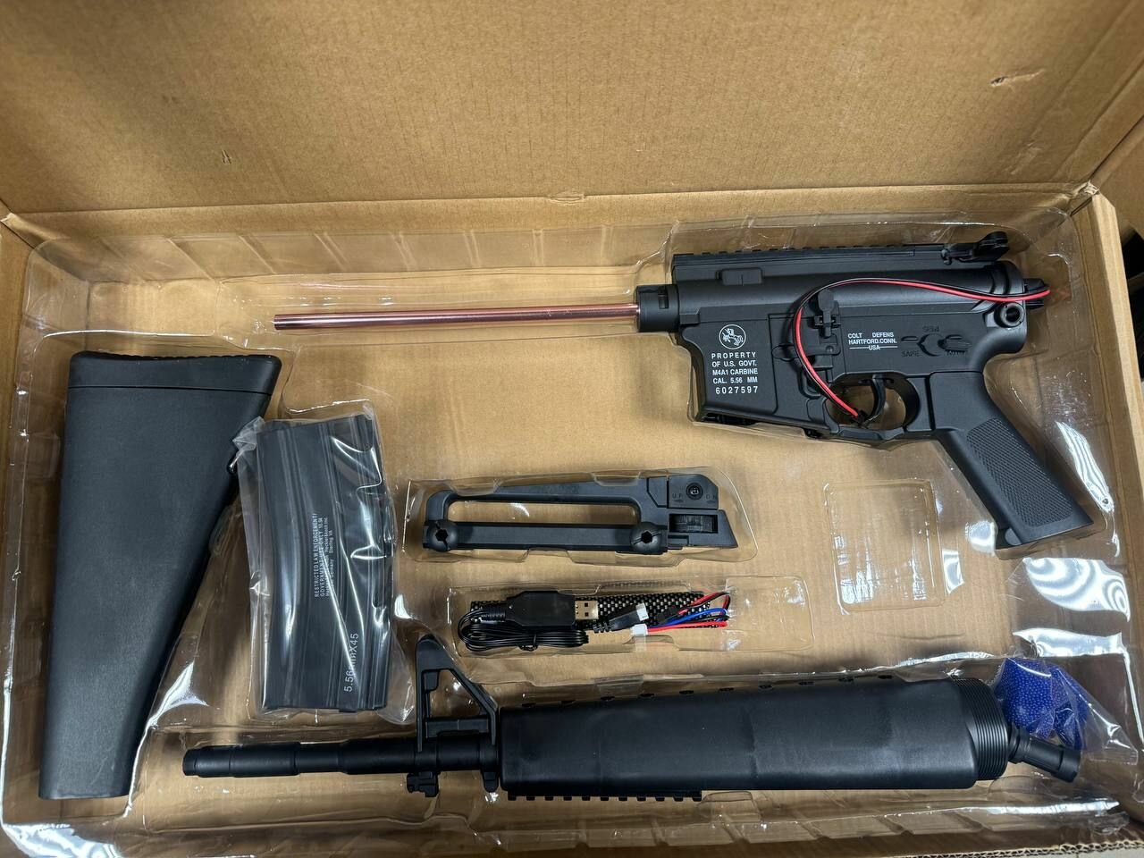 | Комплектация | - автомат; - аккумулятор; - зарядка (USB); - 500 орбиз шаров, -защитные очки; -глушитель; -лазерный прицел |